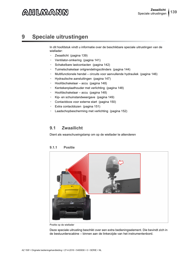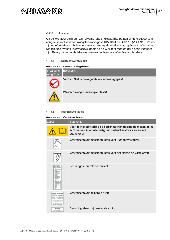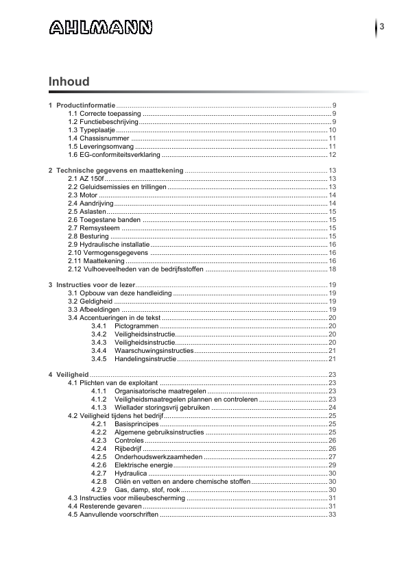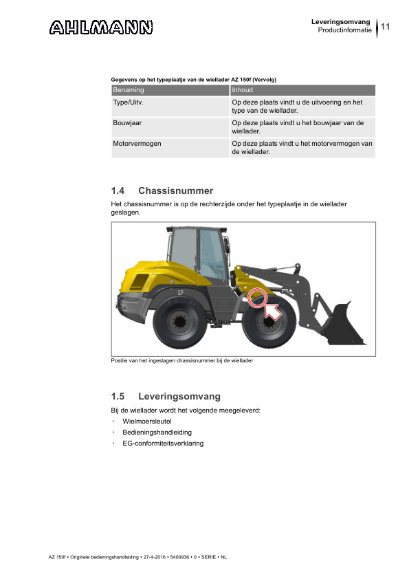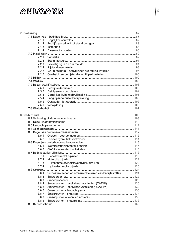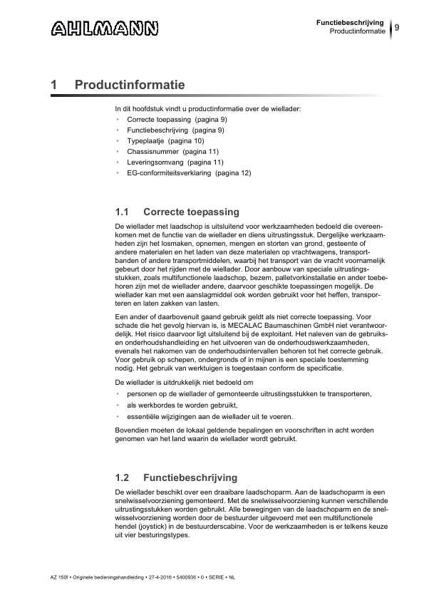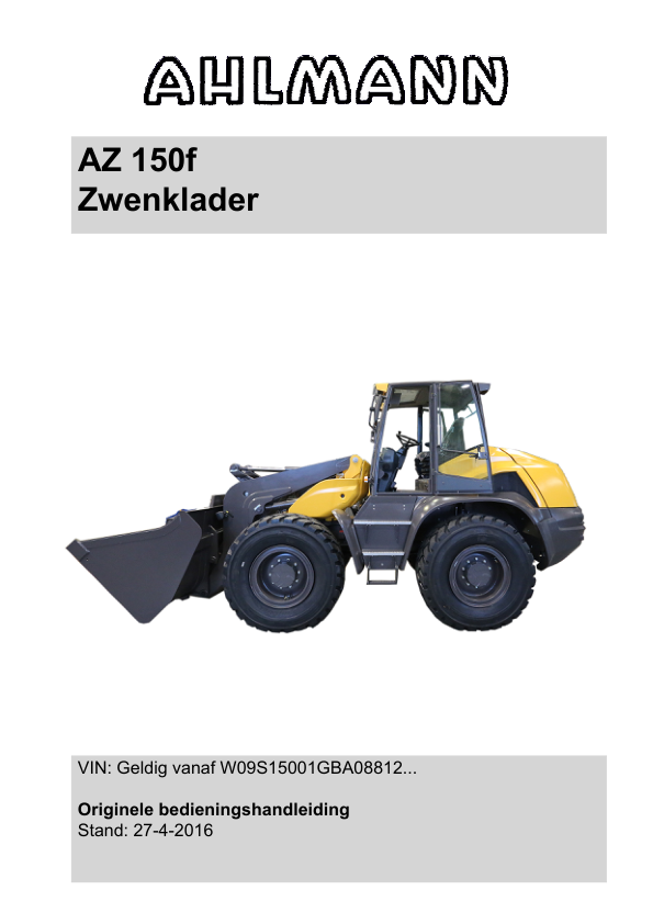 Ahlmann AZ 150f Wheel Loader Operation Manual SN from W09S15001GBA08812 NL