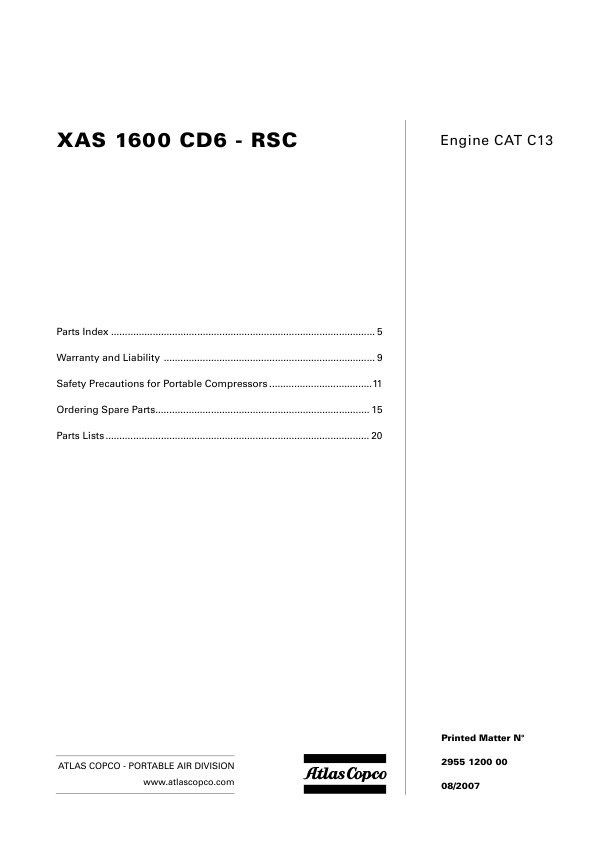 Atlas Copco XAS 1600 CD6 RSC Portable Compressor Parts List