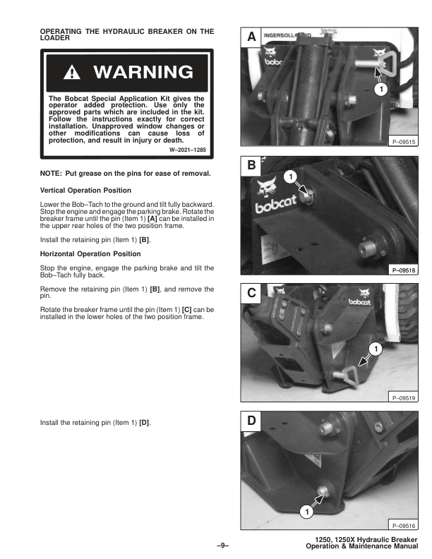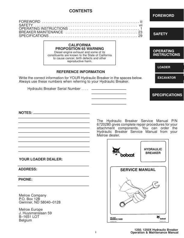 Bobcat 1250 Hydraulic Breaker Operators Manual