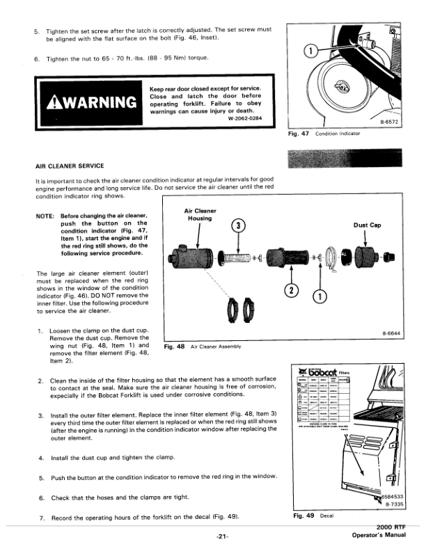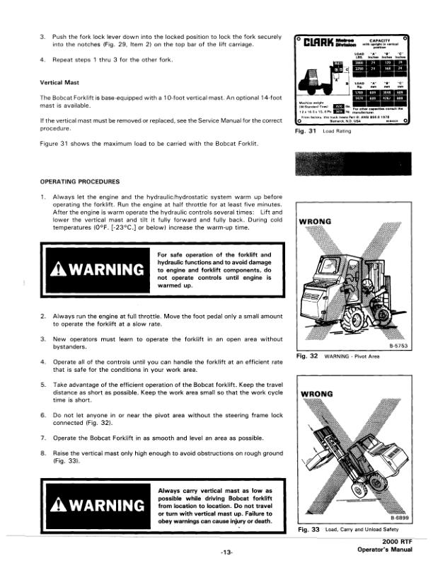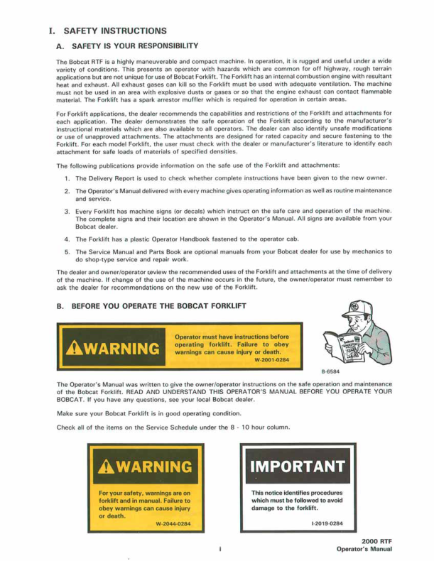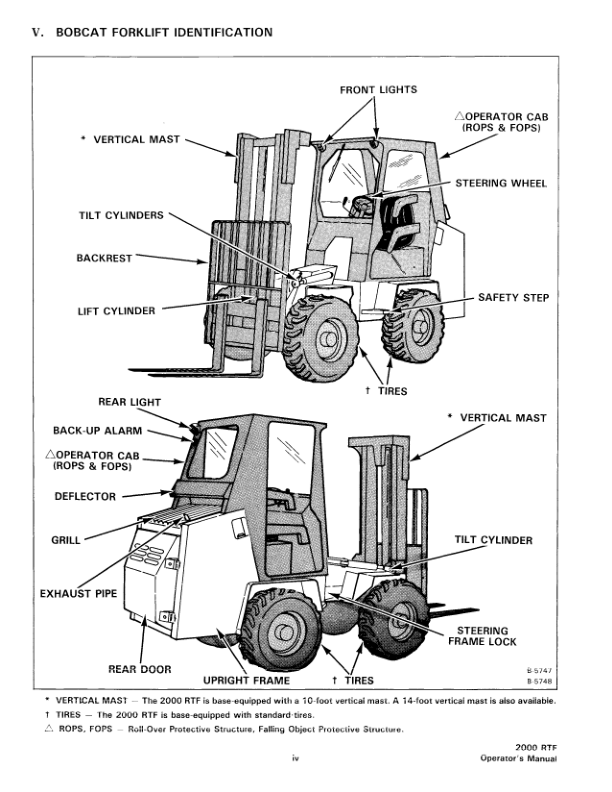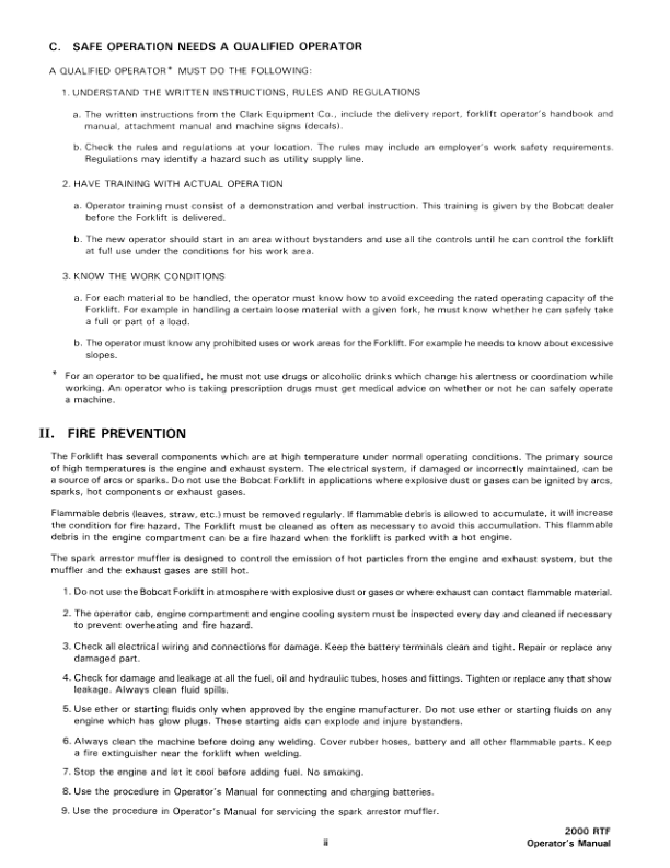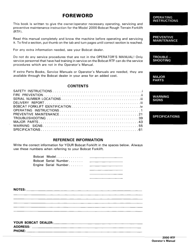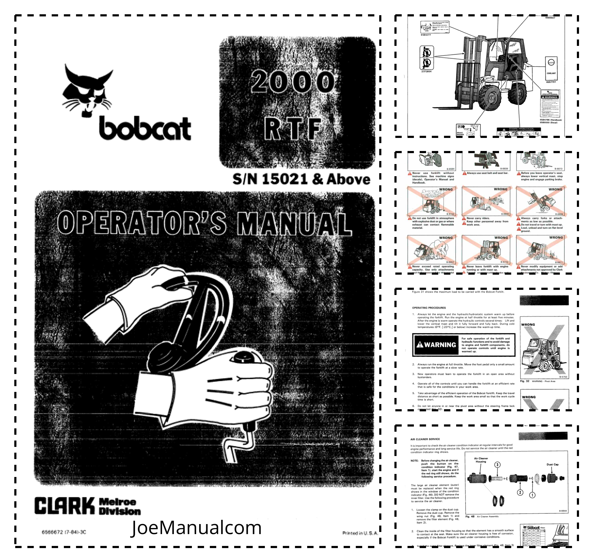Bobcat 2000 RTF Forklift Operation and Maintenance Manual 15021 This manual is a comprehensive resource designed to provide operators and maintenance personnel with detailed instructions for the safe and efficient operation of the Bobcat 2000 RTF forklift. It includes step-by-step guidance on daily use, routine maintenance tasks, system checks, and troubleshooting common issues. The document covers essential safety protocols, technical specifications, and performance parameters to ensure compliance with industry standards and best practices. Additionally, it outlines procedures for inspecting critical components, performing preventive maintenance, and replacing parts as needed. The manual serves as an invaluable tool for maximizing equipment longevity, minimizing downtime, and maintaining optimal productivity. It is structured to support both new and experienced users in understanding the forklift’s capabilities and limitations while promoting responsible handling and upkeep.