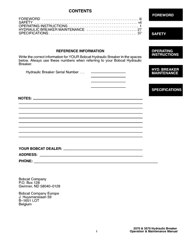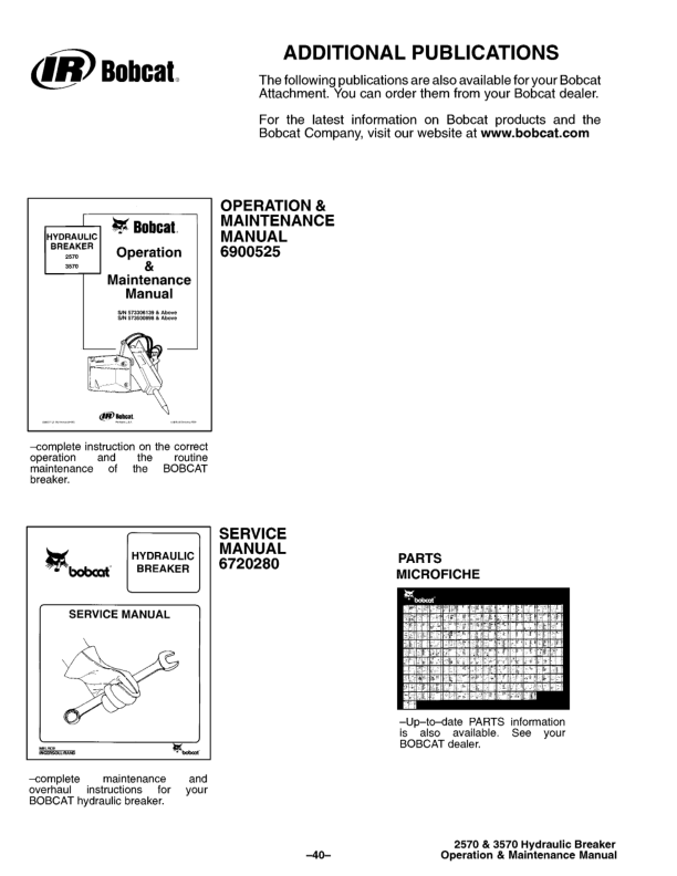 Bobcat 2570 3570 Hydraulic Breaker Operation and Maintenance 5733 5735 This comprehensive guide provides essential information on operating and maintaining the Bobcat 2570 and 3570 hydraulic breakers equipped with models 5733 and 5735. Designed for heavy-duty applications, the hydraulic breaker is a critical attachment for tasks such as demolition, rock breaking, and pavement crushing. The manual covers key procedures including startup and shutdown protocols, daily inspections, lubrication schedules, and troubleshooting common issues to ensure optimal performance and longevity. It emphasizes the importance of adhering to safety guidelines and proper maintenance practices to minimize downtime and maximize equipment efficiency. Detailed instructions for hydraulic system checks, tool attachment procedures, and operational adjustments are included to assist users in maintaining peak functionality. Whether for routine upkeep or addressing unexpected malfunctions, this resource serves as a reliable reference for operators and technicians to keep their machinery running smoothly.