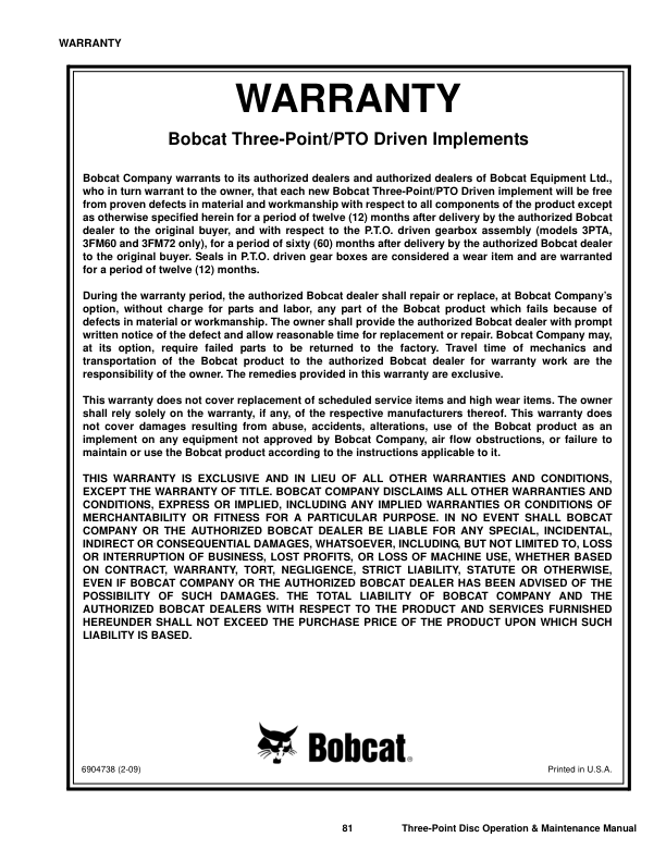 Bobcat 3DH72 3DH84 Three Point Disc Harrow Operation and Maintenance Manual
