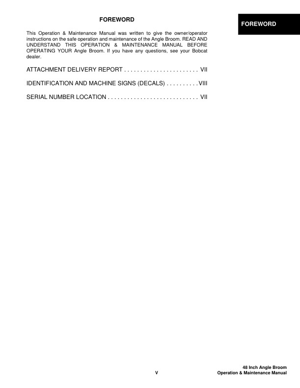 Bobcat 48 Inch Angle Broom Operation and Maintenance Manual This manual serves as a comprehensive guide for users of the Bobcat 48-inch angle broom, providing detailed instructions on how to operate, maintain, and troubleshoot the equipment effectively. It covers essential procedures such as pre-operation checks, safe handling techniques, and routine maintenance tasks to ensure optimal performance and longevity of the machine. The document also includes troubleshooting tips for common issues and outlines technical specifications to help users understand the broom’s capabilities and limitations. Designed for both new and experienced operators, this manual ensures that all maintenance and operational requirements are met in accordance with the manufacturer’s recommendations, promoting efficiency and safety in daily use.