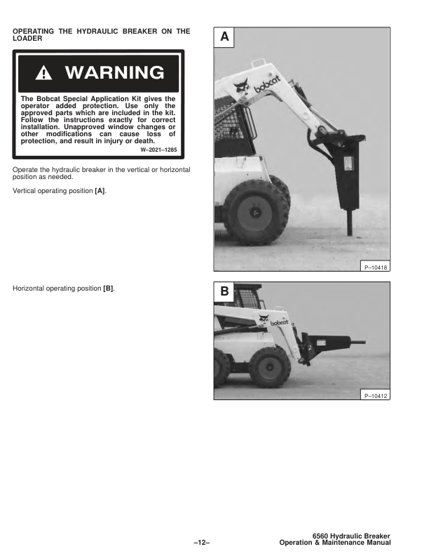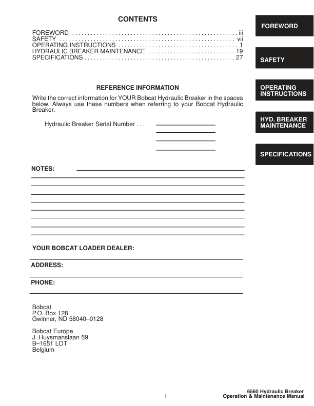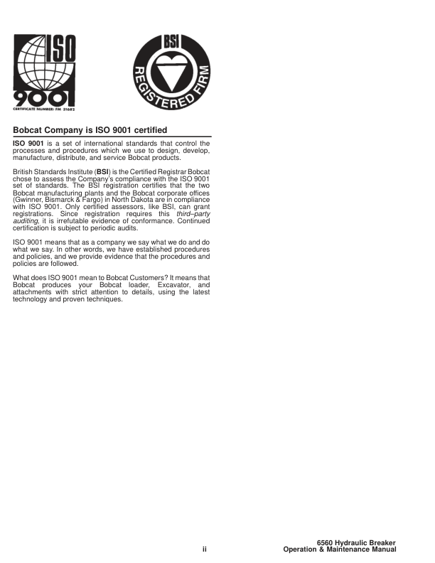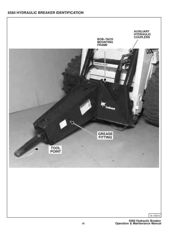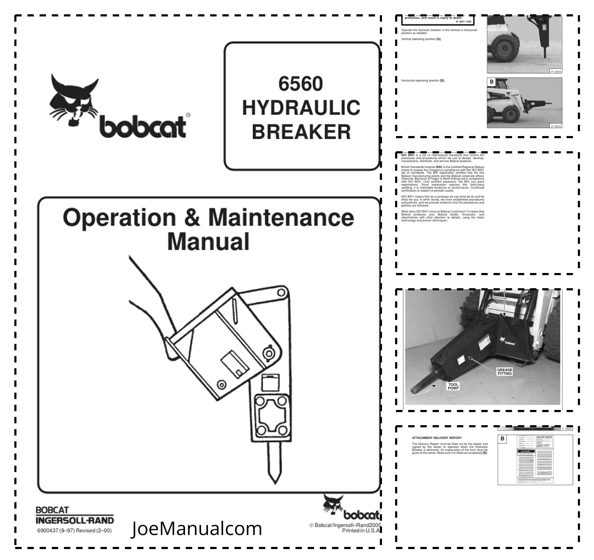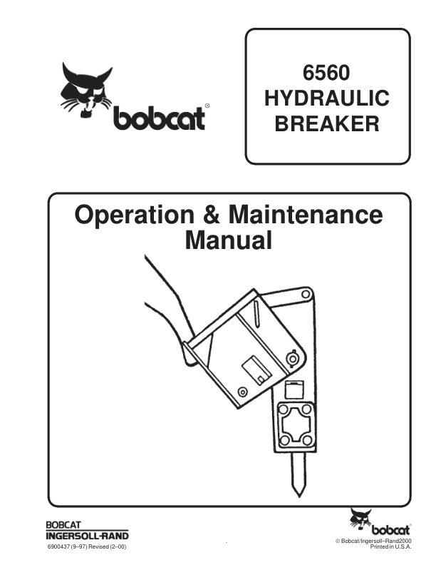 Bobcat 6560 Hydraulic Breaker Operation and Maintenance This comprehensive guide provides essential information for safely operating and maintaining the Bobcat 6560 hydraulic breaker, a powerful tool designed for heavy-duty demolition and breaking tasks. It covers detailed procedures for startup, shutdown, and routine inspections to ensure optimal performance and longevity of the equipment. The manual emphasizes proper handling techniques, including correct attachment installation, pressure adjustments, and safety protocols to prevent accidents during operation. Maintenance instructions include lubrication schedules, hydraulic fluid checks, and replacement of wear parts such as the piston and hammer assembly. Additionally, it offers troubleshooting tips for common issues like hydraulic leaks, overheating, or reduced impact force, helping users address problems promptly. By following the recommended practices outlined in this guide, operators can maximize productivity, minimize downtime, and extend the lifespan of the hydraulic breaker. The document also highlights the importance of regular servicing and adherence to the manufacturer’s specifications to maintain equipment reliability and efficiency in demanding applications.