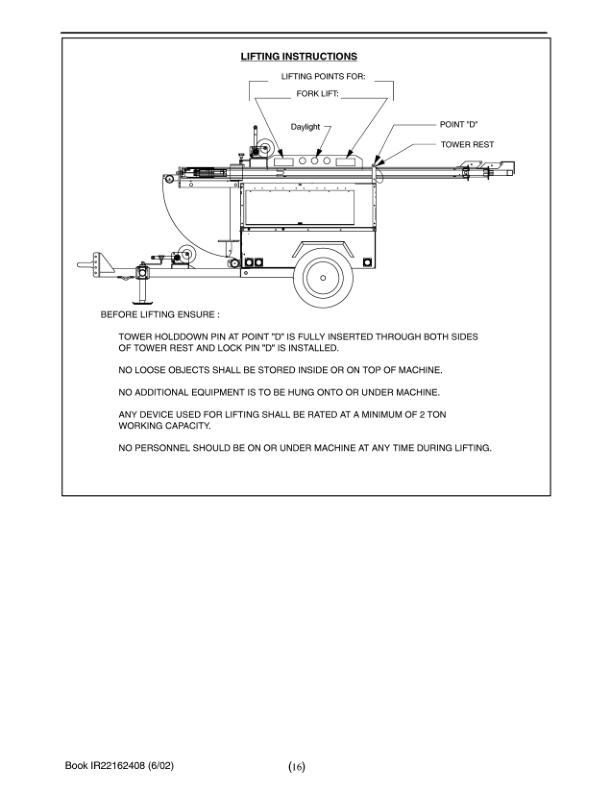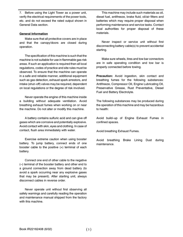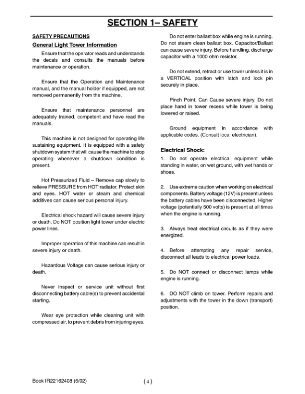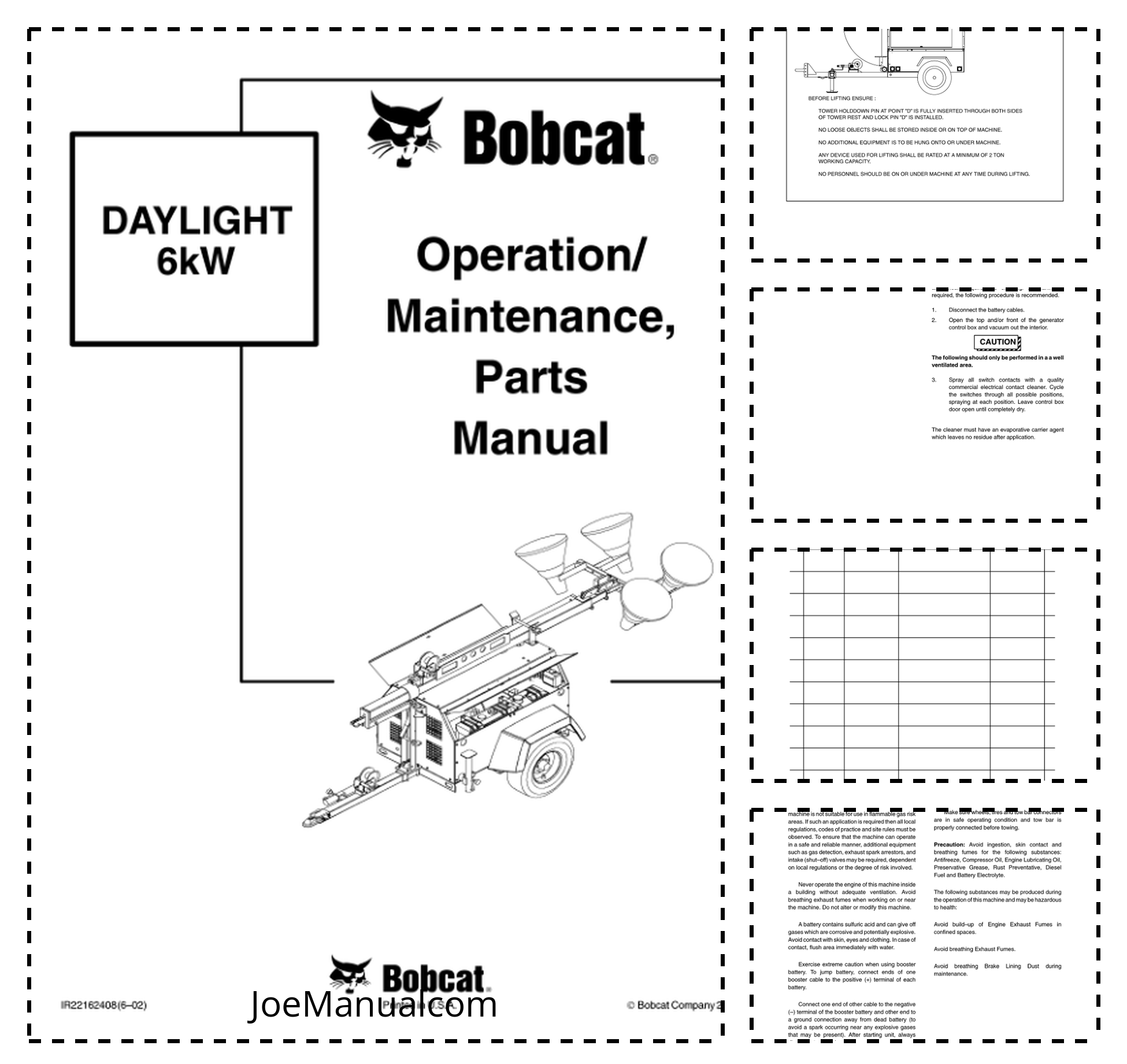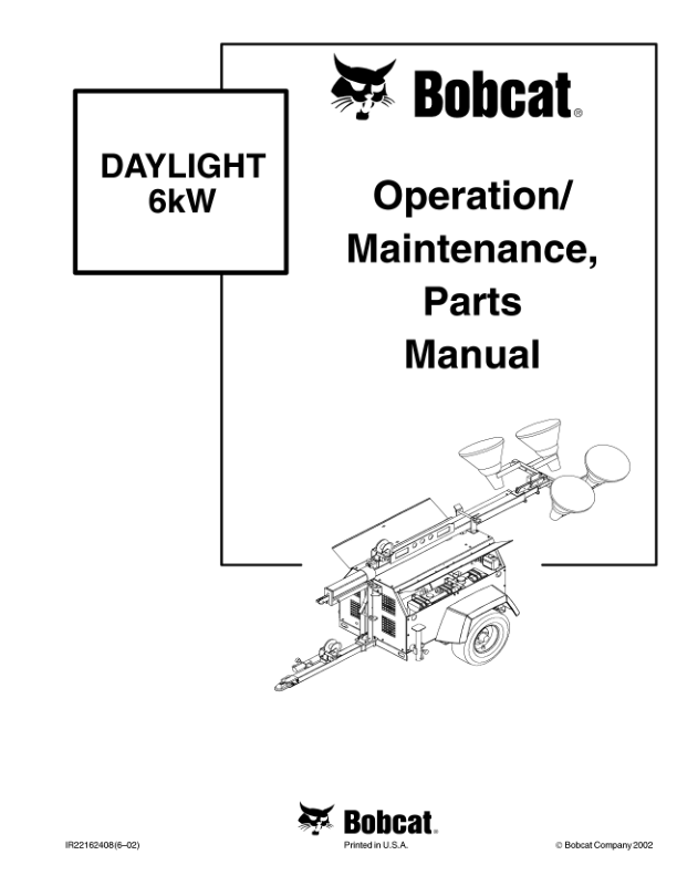 Bobcat 6 k W Daylight Tower Operation Maintenance Parts Manual This manual provides essential guidance for operating, maintaining, and servicing the Bobcat 6k W Daylight Tower ensuring optimal performance and longevity of the equipment. It includes detailed procedures for daily operations, routine maintenance tasks, and troubleshooting common issues to help users and technicians efficiently manage the tower’s functionality. The document also features comprehensive parts identification and diagrams to assist with repairs and replacements, making it a valuable resource for understanding the machine’s components and their roles. By following the instructions outlined in this manual, operators can maintain safety standards, minimize downtime, and extend the lifespan of the equipment. It serves as a critical tool for both initial setup and ongoing care, offering clarity on technical specifications and best practices for effective use.