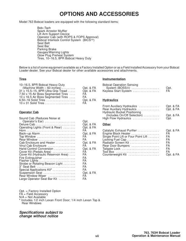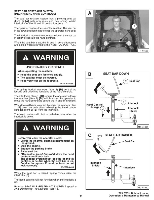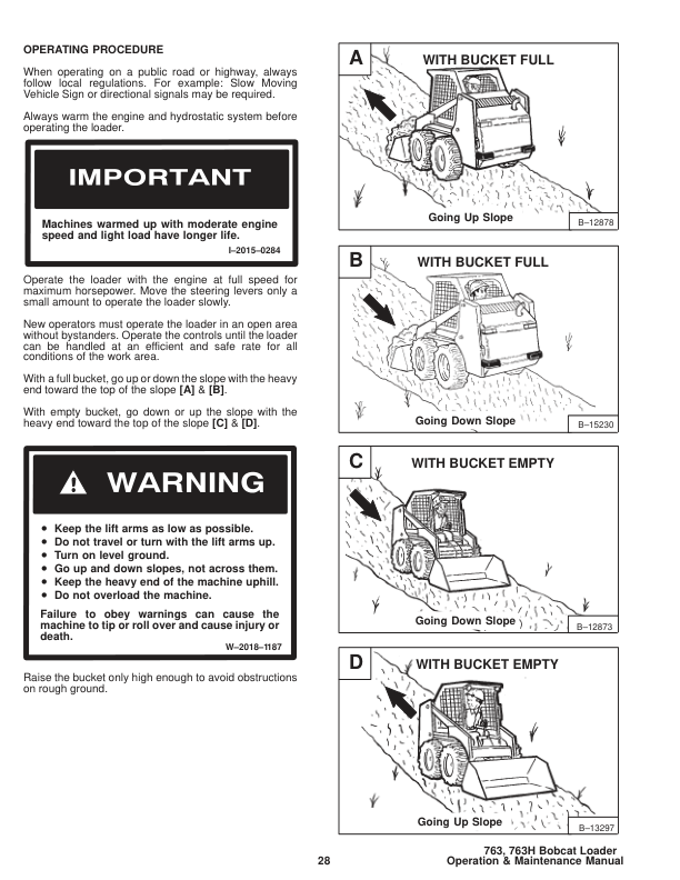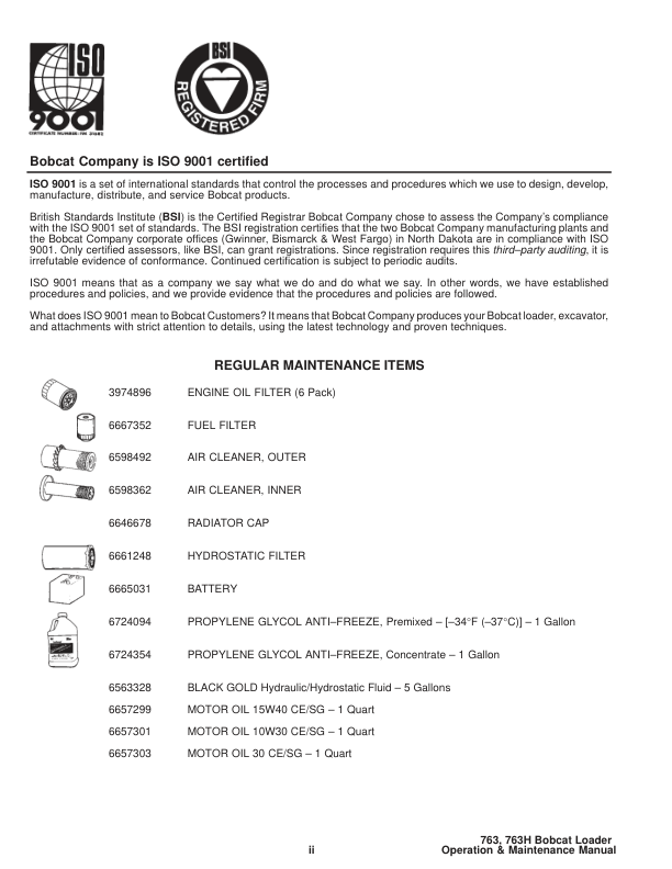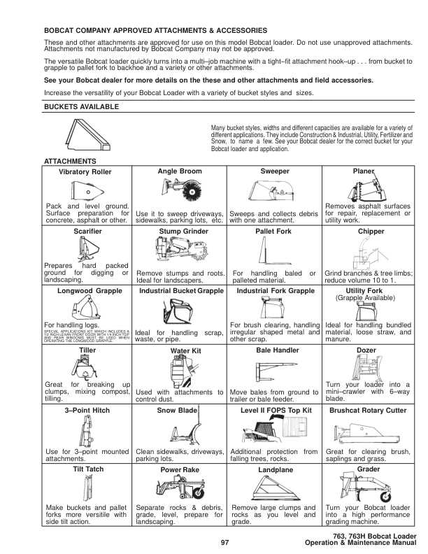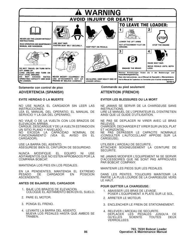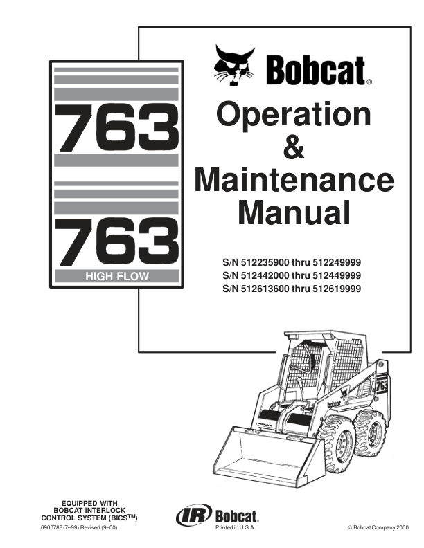 Bobcat 763 763H Skid Steer Loader Operators Manual 5122 5124 5126 Rev 09 2000
