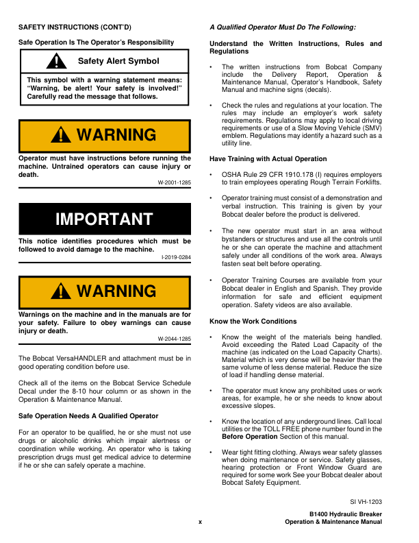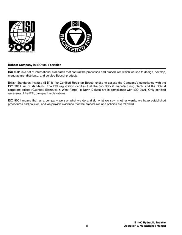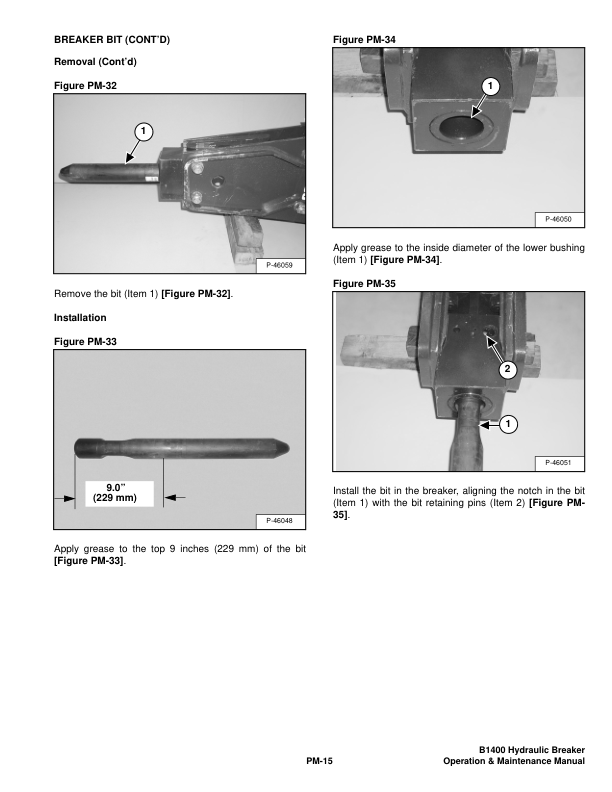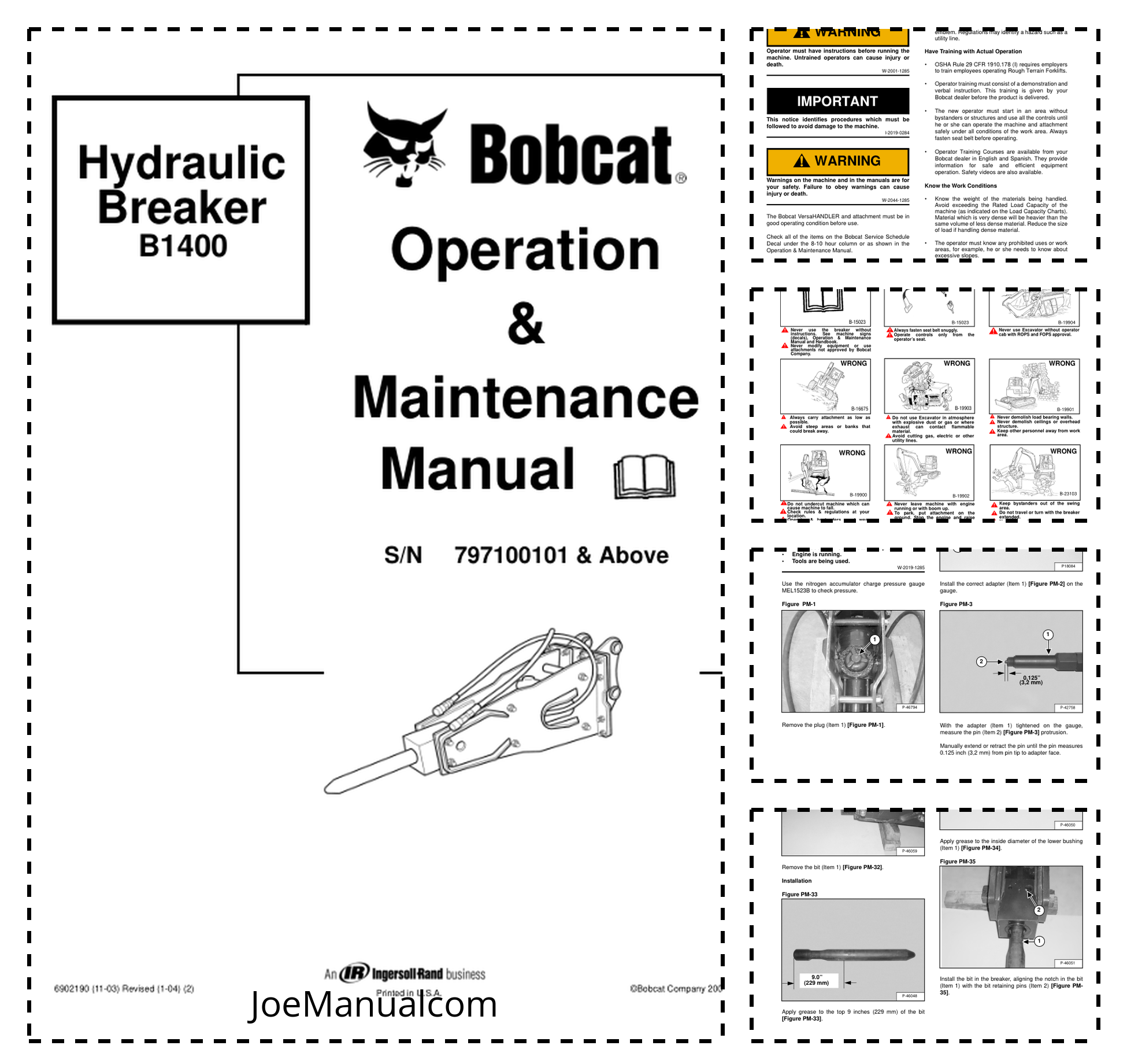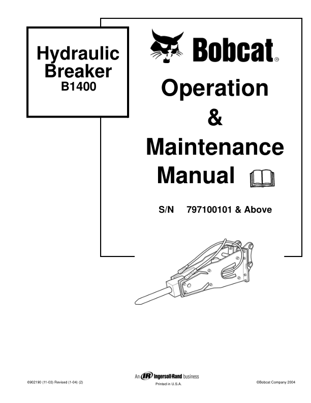 Bobcat B1400 Hydraulic Breaker Operation and Maintenance This comprehensive guide provides essential information for safely and efficiently operating and maintaining the Bobcat B1400 Hydraulic Breaker, a powerful tool designed for heavy-duty demolition and breaking tasks. It covers detailed instructions on startup procedures, daily usage, and shutdown protocols to ensure optimal performance and longevity of the equipment. The manual emphasizes proper handling techniques, safety precautions, and routine maintenance practices such as inspecting hydraulic components, lubricating moving parts, and checking fluid levels. Additionally, it includes troubleshooting tips and guidance on replacing worn parts to minimize downtime and maximize productivity. By following the recommended maintenance schedule and operational guidelines, users can maintain the breaker’s reliability, enhance safety standards, and extend its service life in demanding construction and industrial environments.