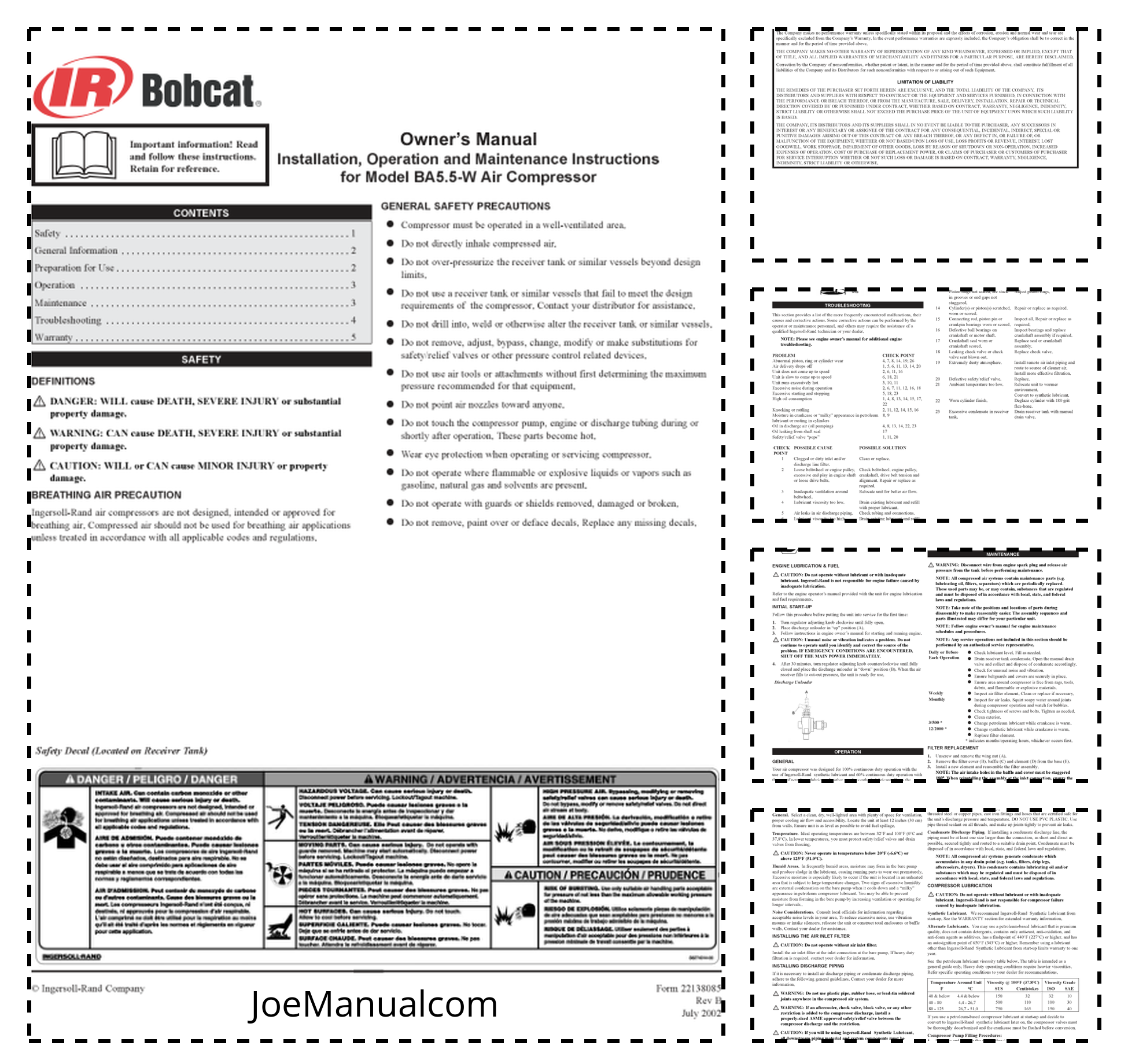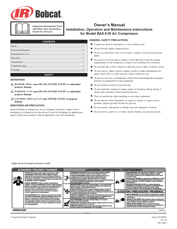Bobcat BA5.5 W Air Compressor Operators Manual 2213 The Bobcat BA5.5 W Air Compressor Operators Manual 2213 is a comprehensive guide designed to provide operators and maintenance personnel with essential information for the proper use, operation, and upkeep of the BA5.5 W air compressor. This manual includes detailed instructions for setup, daily operations, routine maintenance, troubleshooting common issues, and safety protocols to ensure optimal performance and longevity of the equipment. It serves as a critical reference for understanding technical specifications, system components, and recommended practices for efficient and safe handling. The document is structured to assist both new and experienced users in maximizing productivity while adhering to manufacturer guidelines and best practices for equipment care.