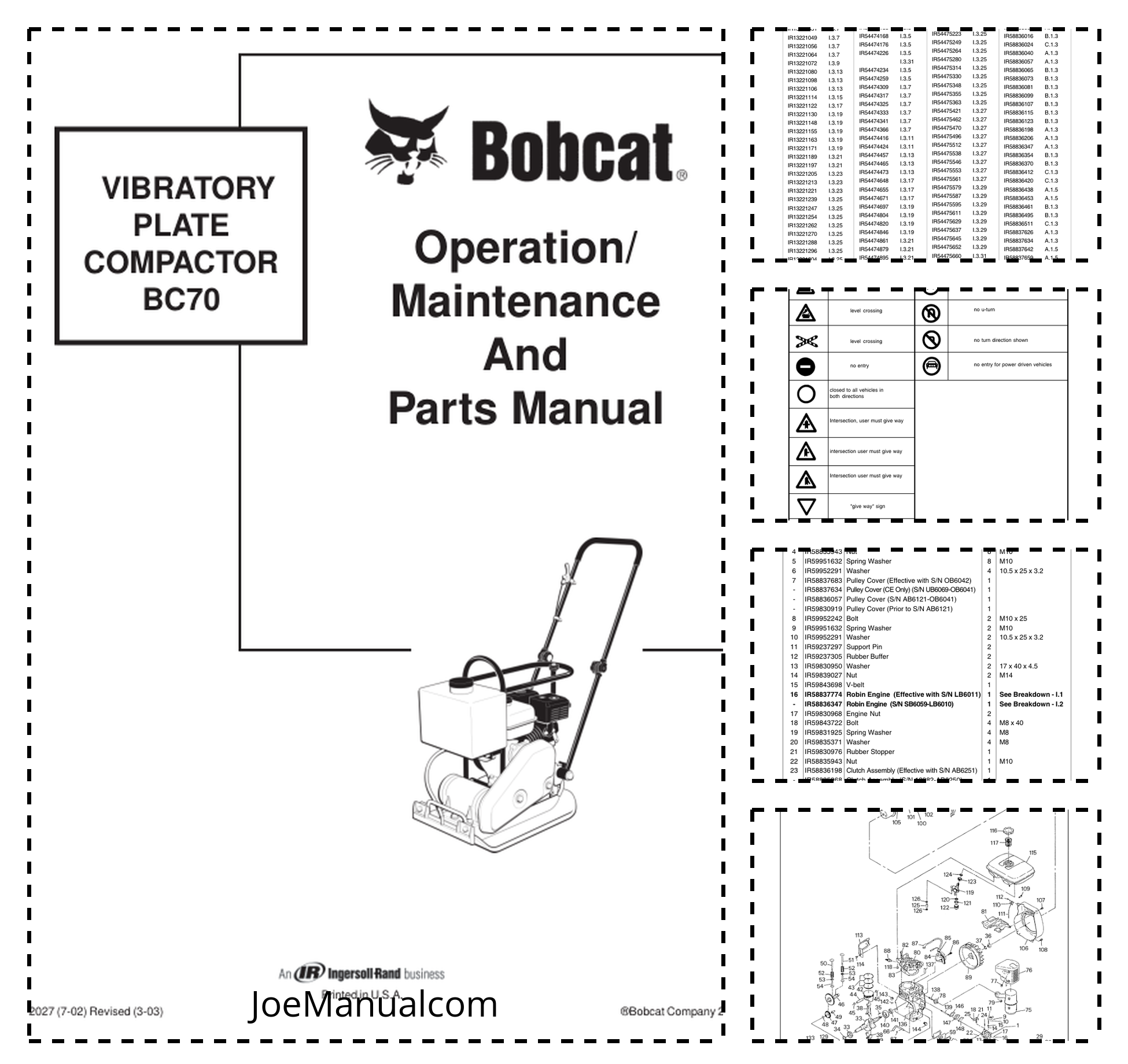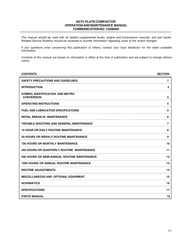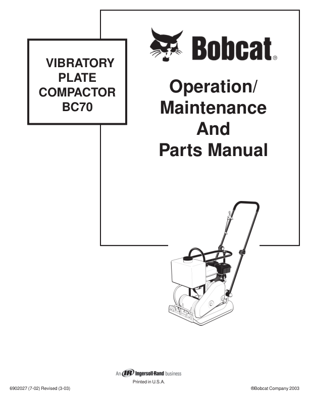Bobcat BC70 Plate Compactor Operation Maintenance Parts Manual This manual serves as an essential resource for operators and maintenance personnel working with the Bobcat BC70 Plate Compactor. It provides detailed instructions for daily operations, routine maintenance tasks, and troubleshooting common issues, ensuring safe and efficient use of the equipment. The document includes diagrams, part identification, and specifications necessary for proper servicing and repair, supporting both preventative care and corrective actions. Designed for clarity and ease of reference, it helps users maximize machine performance while adhering to manufacturer guidelines. Whether for on-site use or storage, this manual is a critical tool for maintaining the reliability and longevity of the Bobcat BC70 Plate Compactor.