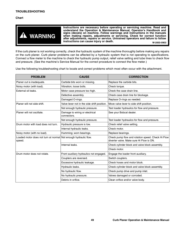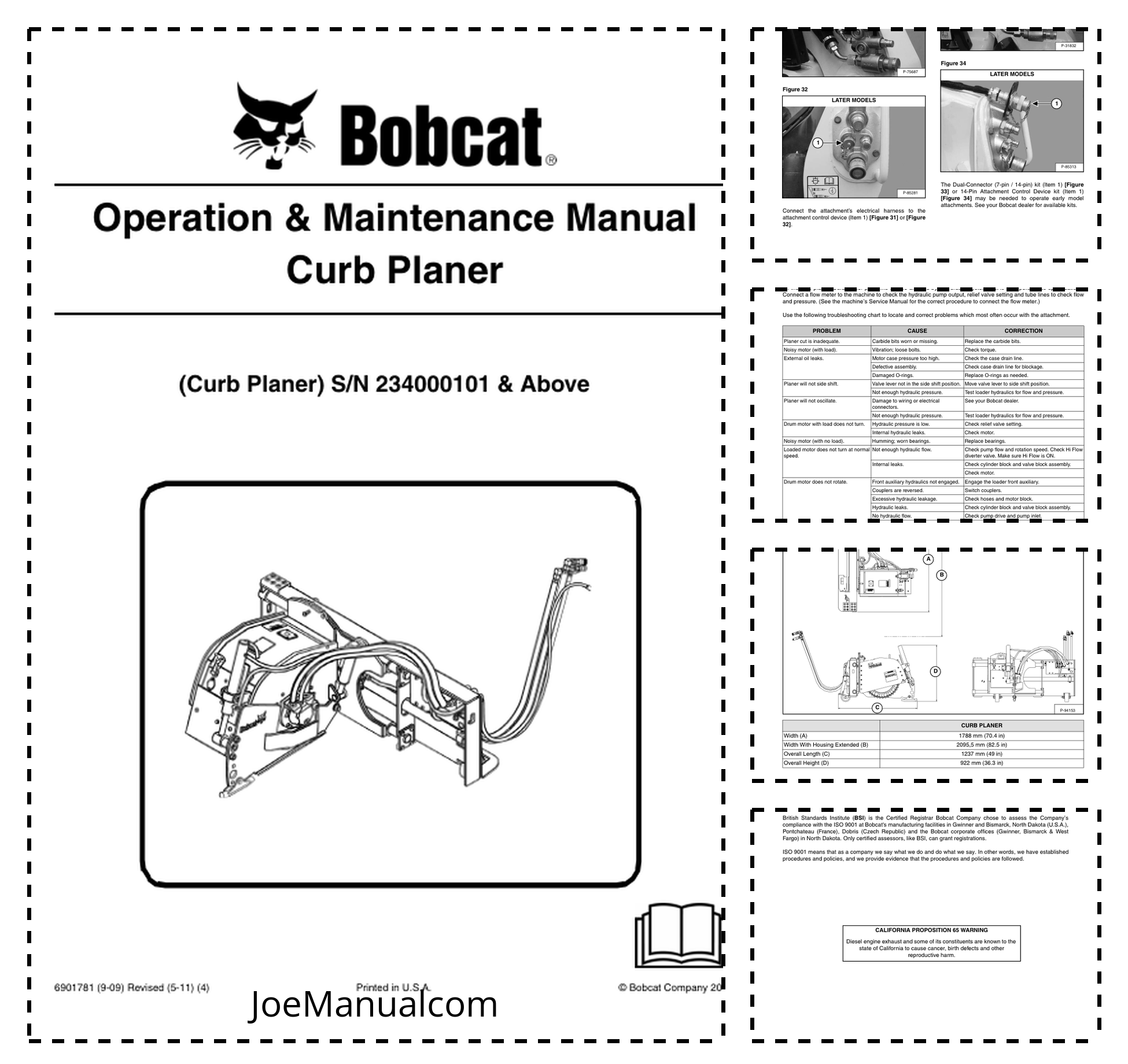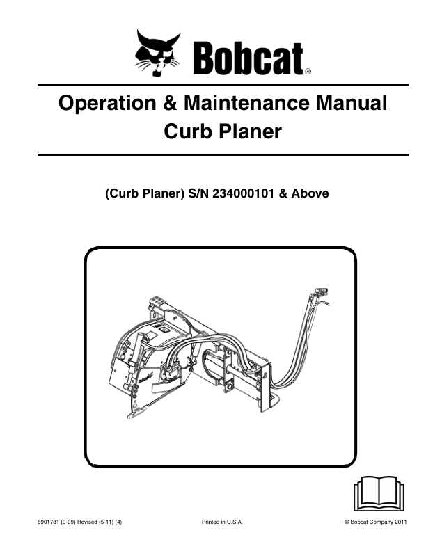 Bobcat Curb Planer Operation and Maintenance Manual 2340 The Bobcat Curb Planer Operation and Maintenance Manual 2340 is a comprehensive guide designed to provide users with detailed instructions on operating, maintaining, and troubleshooting the Bobcat 2340 curb planer. This manual serves as an essential resource for both new and experienced operators, covering everything from initial setup and daily use procedures to routine maintenance tasks and safety protocols. It includes step-by-step guidance on proper machine operation, lubrication schedules, blade replacement, and system inspections to ensure optimal performance and longevity of the equipment. Additionally, the manual offers troubleshooting tips for common issues and outlines specifications for parts and components, enabling users to perform routine servicing efficiently. By following the recommendations and procedures outlined in this manual, operators can maximize productivity, minimize downtime, and maintain a safe working environment when using the Bobcat 2340 curb planer.