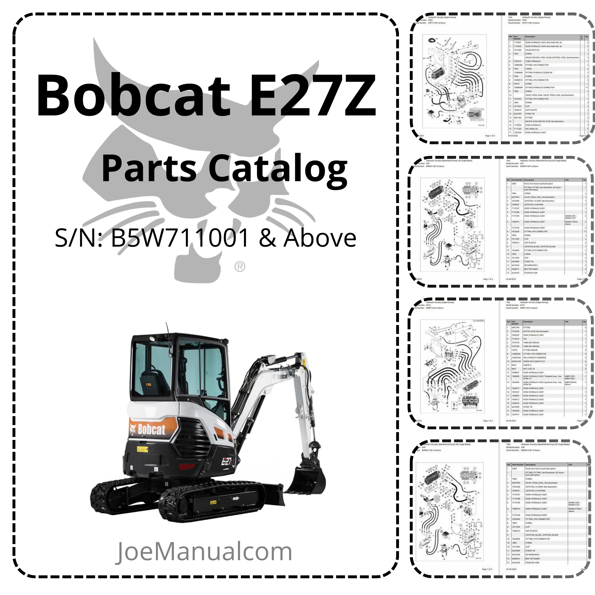 This parts catalog provides detailed information on the components and parts of the Bobcat E27Z excavator. It includes comprehensive lists of all parts, along with exploded diagrams to illustrate the assembly and relationship between different components. Each part is identified with a part number, description, and relevant specifications to aid in accurate identification and ordering. The catalog covers all major systems of the excavator, including the engine, hydraulics, electrical system, undercarriage, and attachments. This document is essential for maintenance personnel, mechanics, and operators to ensure the correct parts are sourced for repairs and maintenance, ensuring the excavator operates efficiently and reliably.