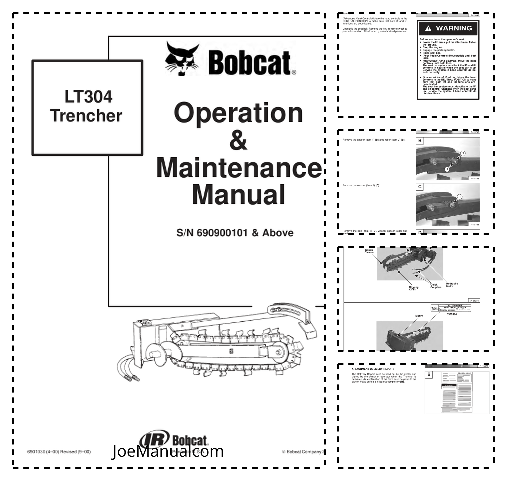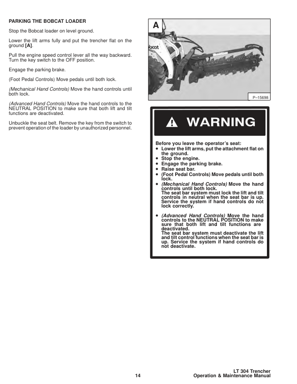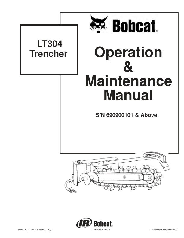 Bobcat LT304 Trencher Operation and Maintenance Manual. This manual provides essential information for the safe and efficient operation and maintenance of the Bobcat LT304 Trencher. It includes detailed instructions, diagrams, and troubleshooting tips to help operators and maintenance personnel keep their equipment running smoothly and reliably. Bobcat LT304 Trencher Operation and Maintenance Manual. A comprehensive guide designed to assist operators and maintenance technicians in the proper use and care of the Bobcat LT304 trencher. This manual contains detailed operating procedures, maintenance schedules, troubleshooting guides, and safety information necessary for optimal performance and longevity of the machine.