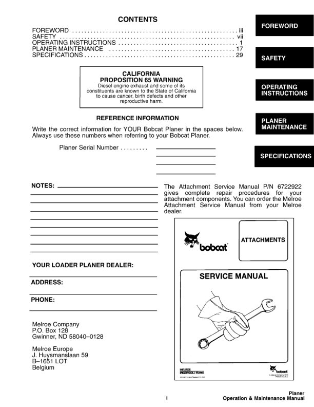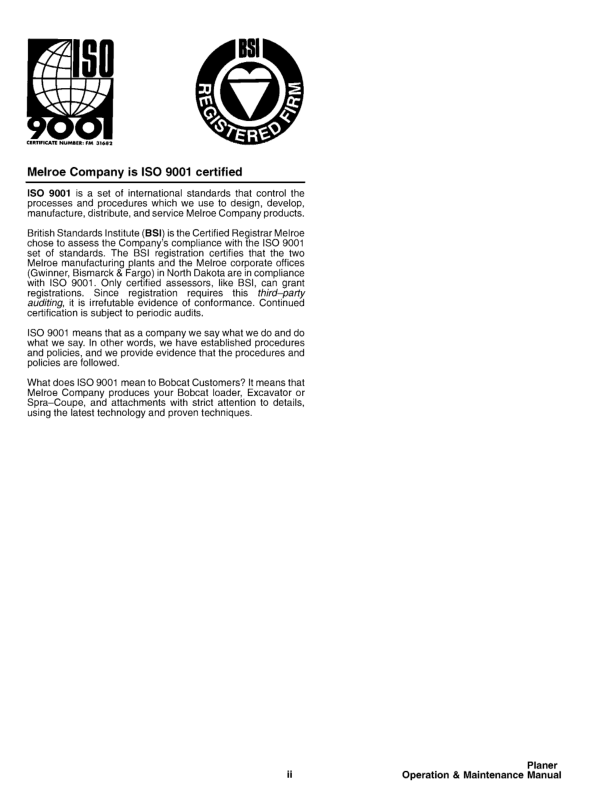 Bobcat Planer Operation and Maintenance Manual 9102 9103