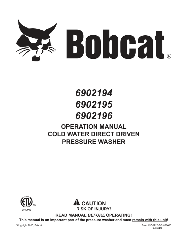 Bobcat Pressure Washer Operation and Maintenance Manual 6902194 95 96. This manual provides essential information for the safe and effective operation and maintenance of Bobcat pressure washers, specifically models associated with the 6902194 part number and covering the years 1995 and 1996. It includes detailed instructions, diagrams, and troubleshooting guides to help users properly use and service their equipment.