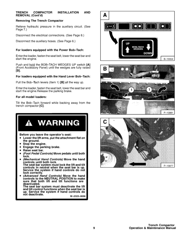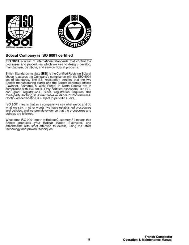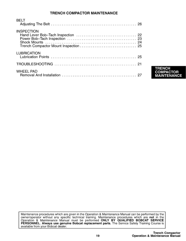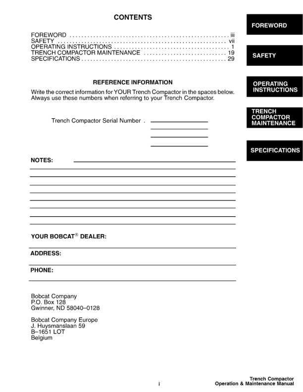 Bobcat Side Shift Trench Compactor Operators Manual. This manual provides essential information for the safe and effective operation and maintenance of your Bobcat side shift trench compactor. It includes detailed instructions, safety guidelines, and troubleshooting tips to help you maximize performance and extend the life of your equipment. Bobcat Side Shift Trench Compactor Operators Manual. Ensure the safe and efficient operation of your Bobcat trench compactor with this comprehensive operators manual. This guide contains vital information regarding operation procedures, maintenance schedules, and safety protocols, designed to optimize performance and longevity of your equipment.