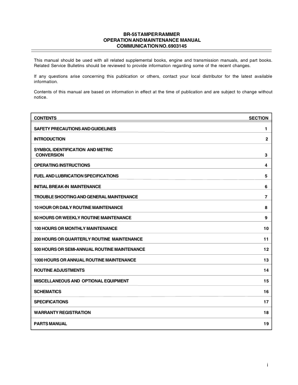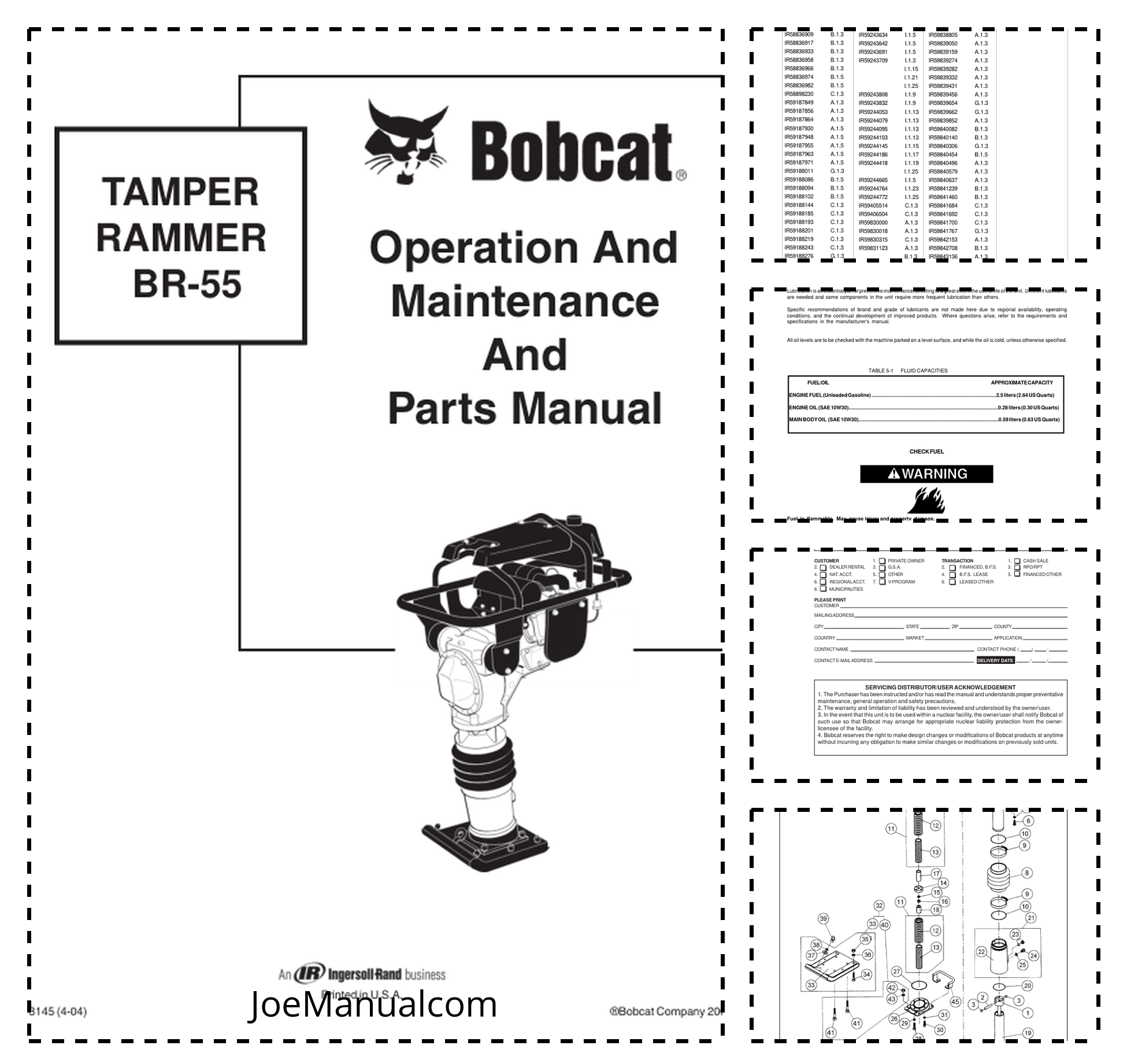 Bobcat Tamper Rammer BR-55 Operation and Maintenance and Parts Manual This comprehensive manual is designed to provide essential guidance for the proper operation, maintenance, and repair of the Bobcat Tamper Rammer BR-55. It includes detailed instructions for daily use, routine inspections, and troubleshooting common issues, ensuring users can maximize the machine’s efficiency and reliability. The document also features clear diagrams and part listings to facilitate easy identification and replacement of components, supporting both routine care and more complex servicing tasks. By following the procedures outlined in this manual, operators and technicians can maintain the equipment’s performance, enhance safety, and prolong its lifespan. It serves as a critical resource for anyone responsible for managing or repairing the BR-55, offering step-by-step guidance to uphold the manufacturer’s standards and best practices.