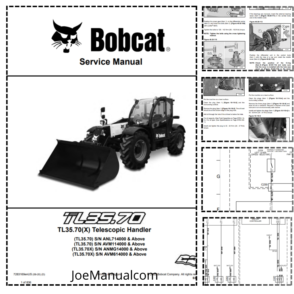 The Bobcat TL35.70 TL35.70X Telescopic Handler Service Manual ANL AVM ANMG is a comprehensive guide designed for the maintenance and repair of the Bobcat TL35.70 telescopic loader. This manual includes detailed instructions on various aspects of servicing the machine, such as engine maintenance, hydraulic systems, electrical components, and troubleshooting. It is an essential resource for technicians and operators to ensure the efficient and safe operation of the Bobcat TL35.70. The manual typically covers routine maintenance tasks, detailed repair procedures, and provides diagrams and illustrations to support the work being performed.