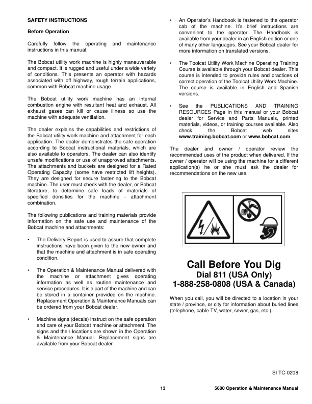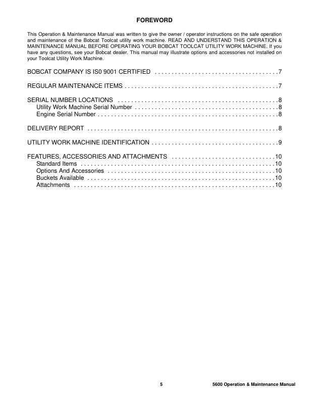Bobcat Toolcat 5600 Utility Work Machine Operation and Maintenance Manual A0W1