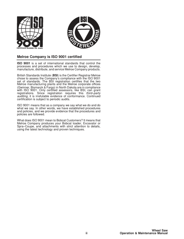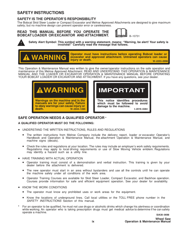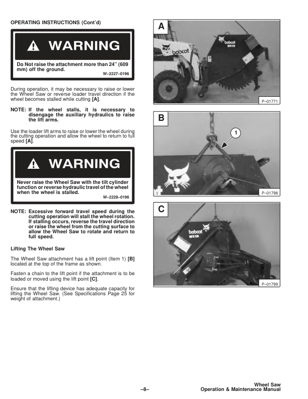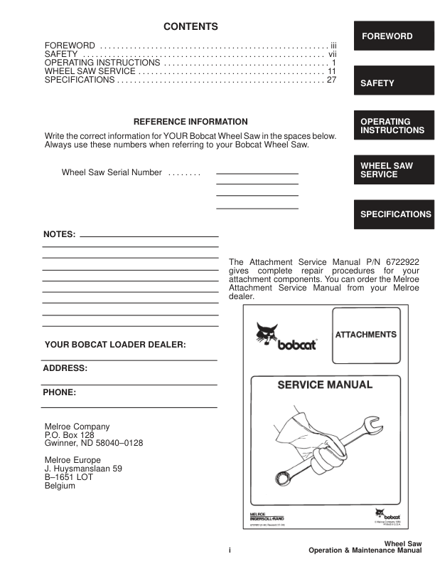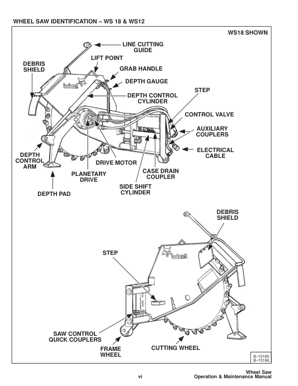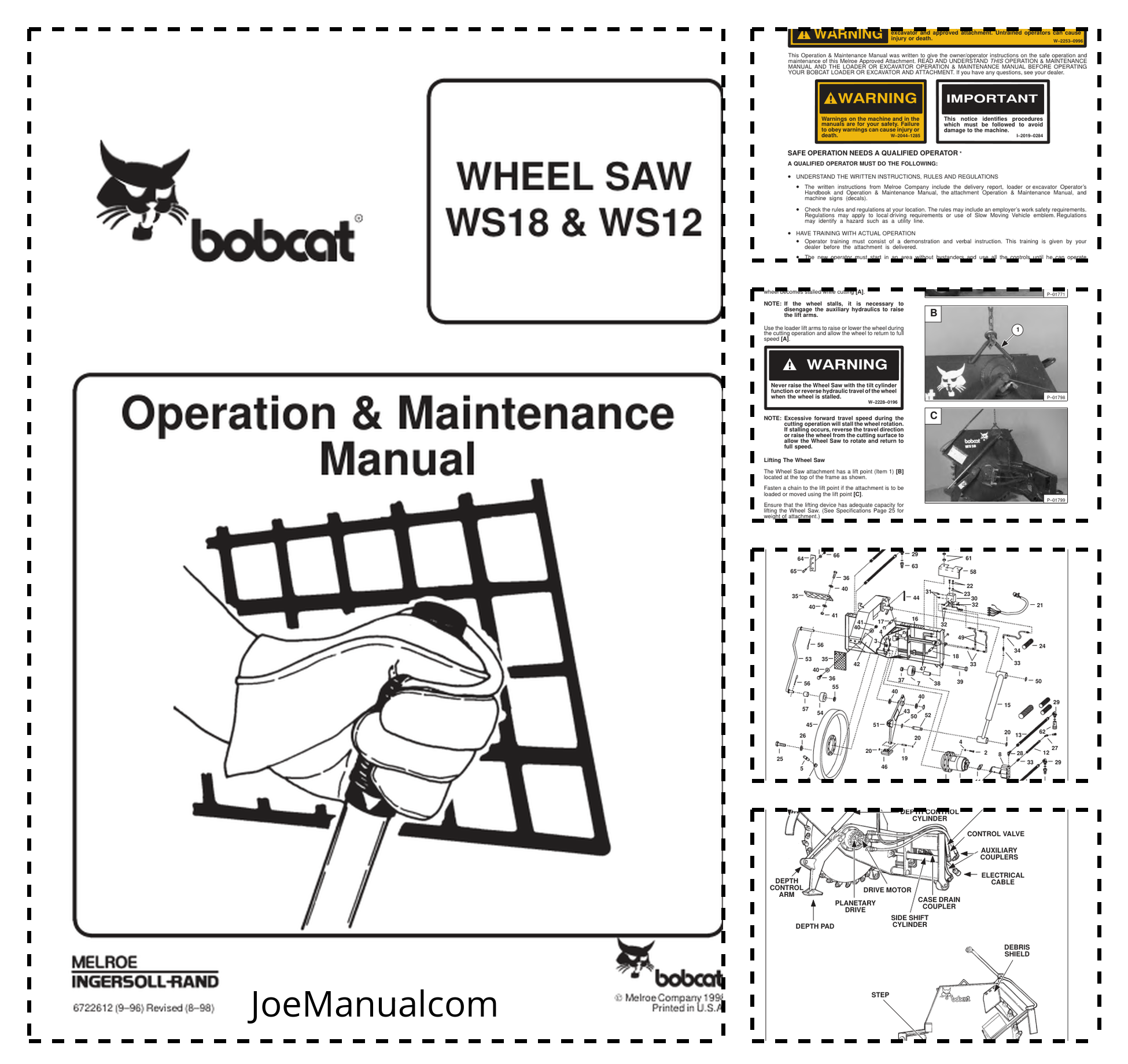 Bobcat WS18 WS12 Wheel Saw Operators Manual This manual serves as an essential resource for operators and maintenance personnel of the Bobcat WS18 and WS12 wheel saws. It provides detailed instructions on safe operation, routine maintenance, troubleshooting common issues, and technical specifications to ensure optimal performance and longevity of the equipment. The document covers essential functions such as starting and stopping the machine, adjusting cutting parameters, inspecting components, and following safety protocols. It also includes information on proper storage, handling, and compliance with safety standards. Designed for clarity and ease of use, this manual is a valuable tool for maximizing productivity while minimizing the risk of equipment damage or operator injury.