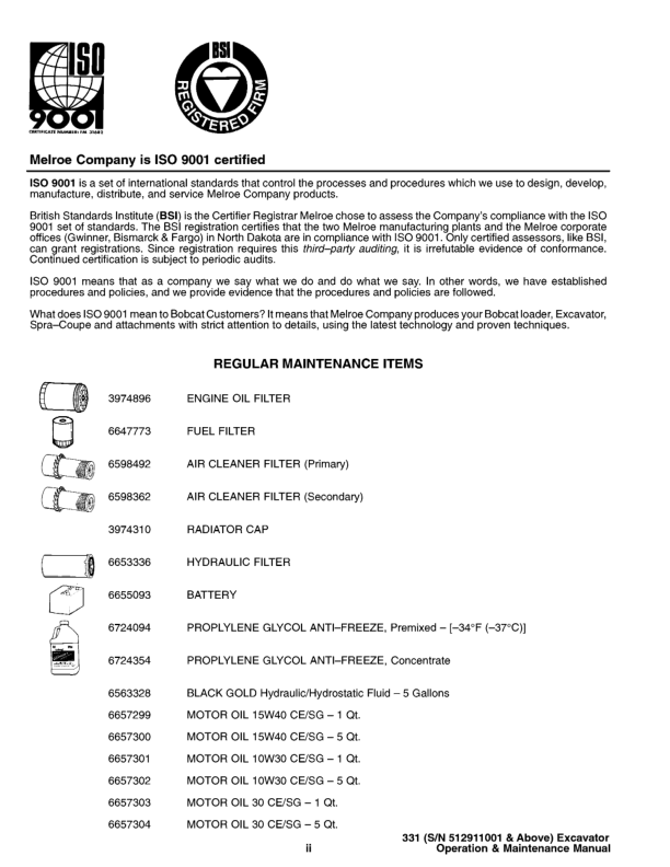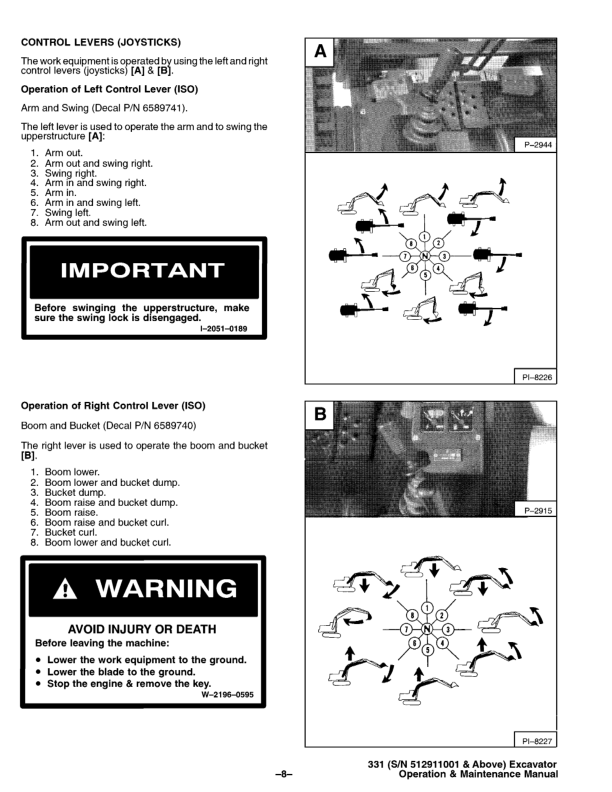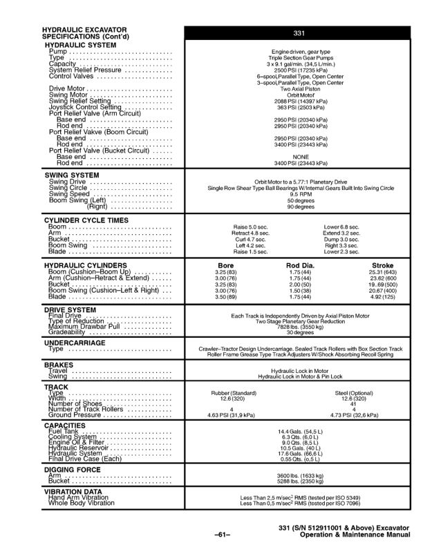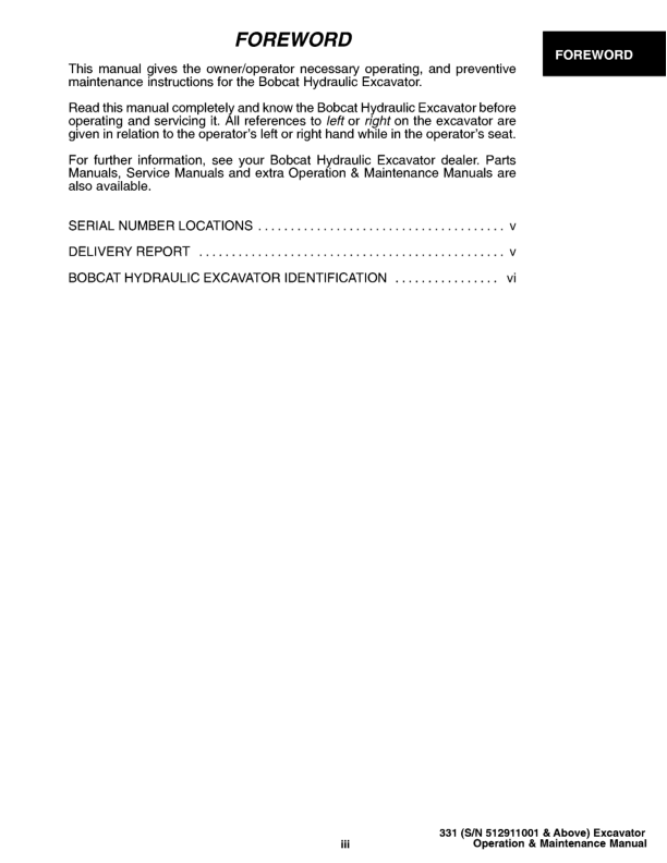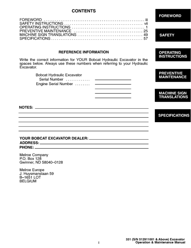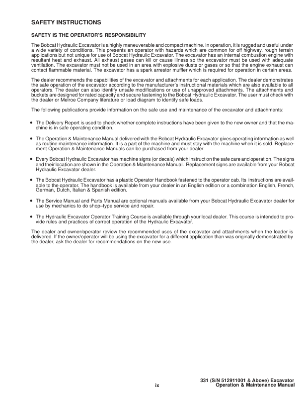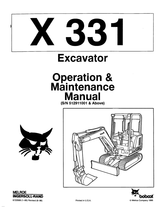 Bobcat X331 Excavator Operation and Maintenance Manual 512911001
