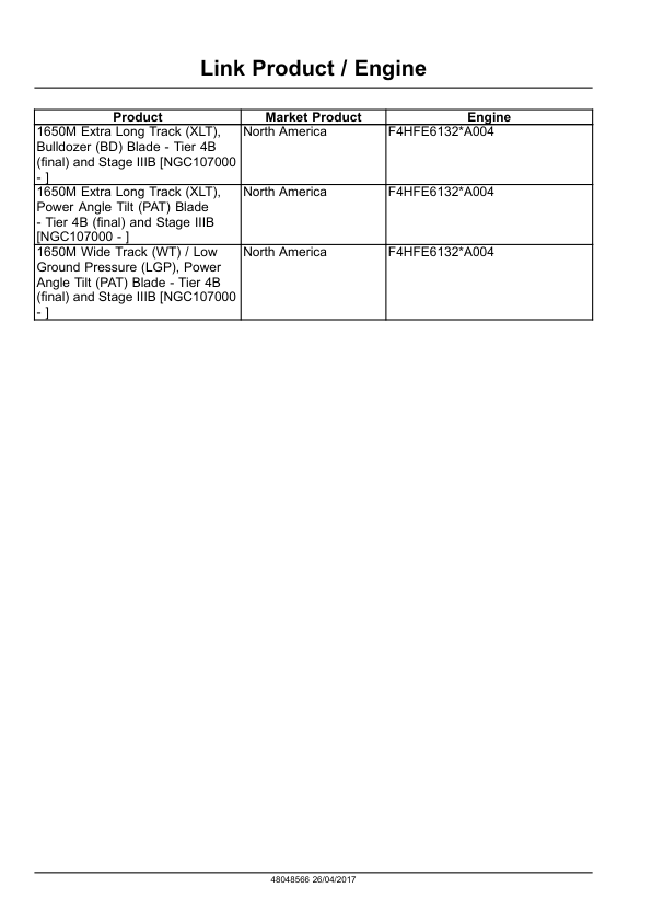 1650M Wide Track (WT) / Low Ground Pressure (LGP) Power Angle Tilt (PAT) Blade – Tier 4B (Final) and Stage IIIB [NGC107000 – ]