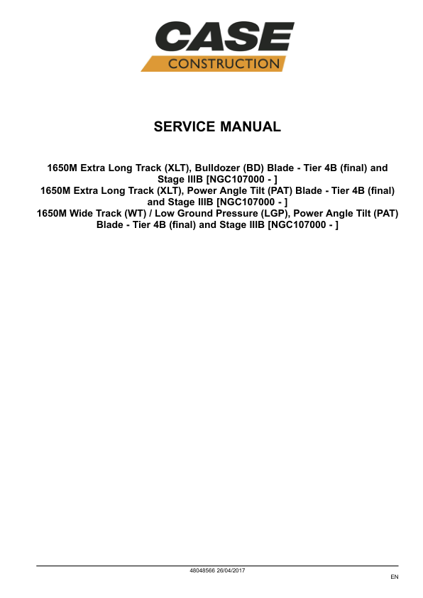 CASE 1650M Tier 4B Crawler Dozer Service Manual PIN NGC107000 and Above