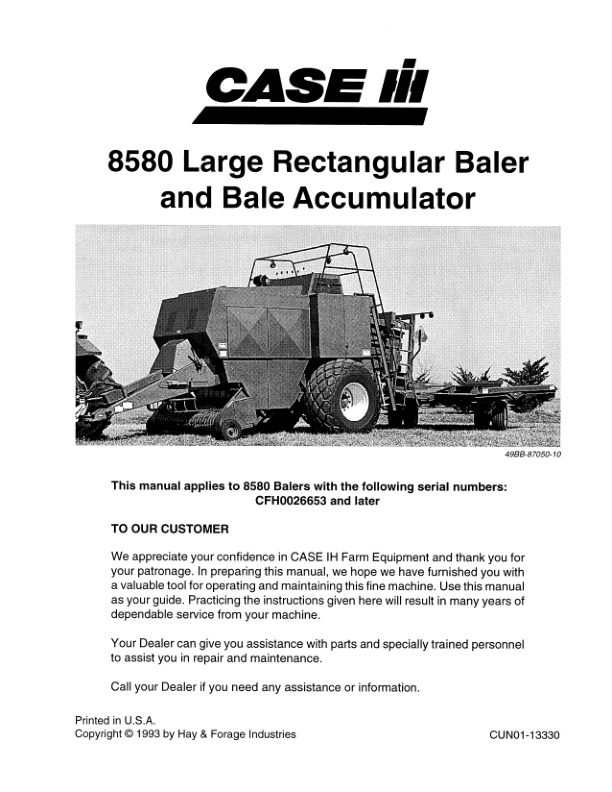 CASE 8580 Large Rectangular Baler and Bale Accumulator Operations Manual SN CFH0026653 and later is a comprehensive guide designed to assist operators and technicians in the safe and efficient use of the CASE 8580 Large Rectangular Baler. This manual covers detailed operational procedures, maintenance protocols, and troubleshooting tips to ensure optimal performance and longevity of the equipment. It provides step-by-step instructions for setting up, operating, and servicing the baler, making it an essential resource for achieving maximum productivity in agricultural and industrial applications. The manual is specifically tailored for balers with serial number CFH0026653 and later, ensuring compatibility and relevance for users. Whether you are a seasoned professional or a new operator, this manual serves as a valuable reference tool to enhance your understanding and proficiency with the CASE 8580 Large Rectangular Baler.
