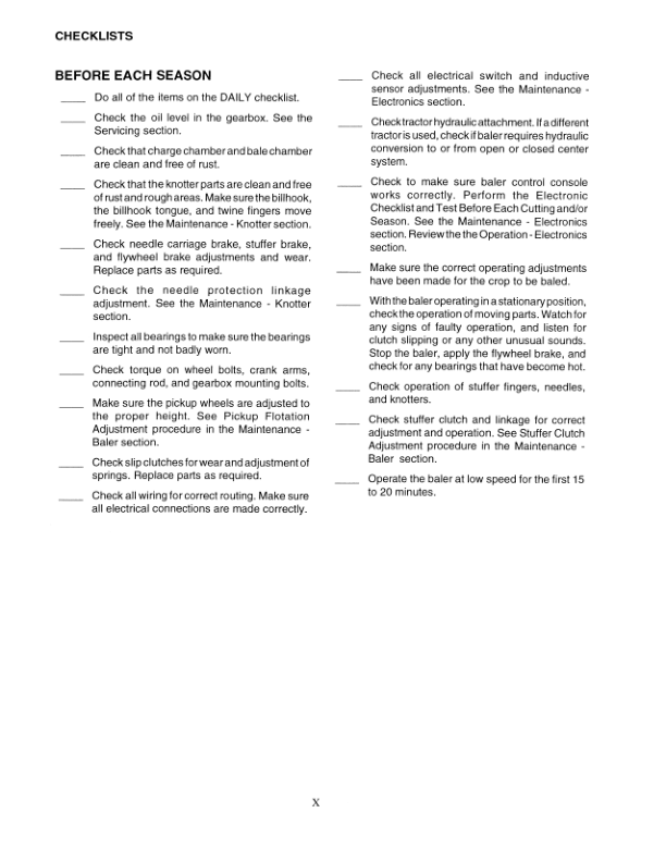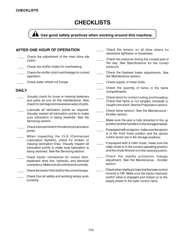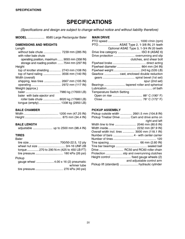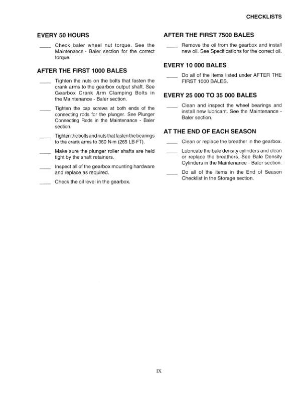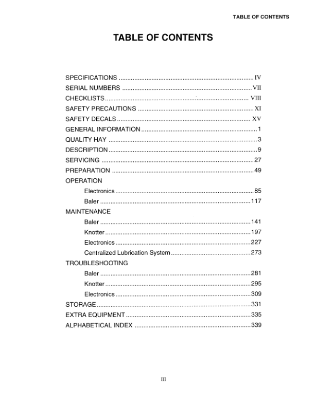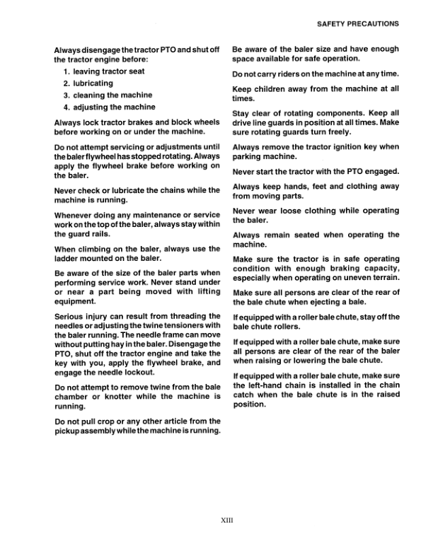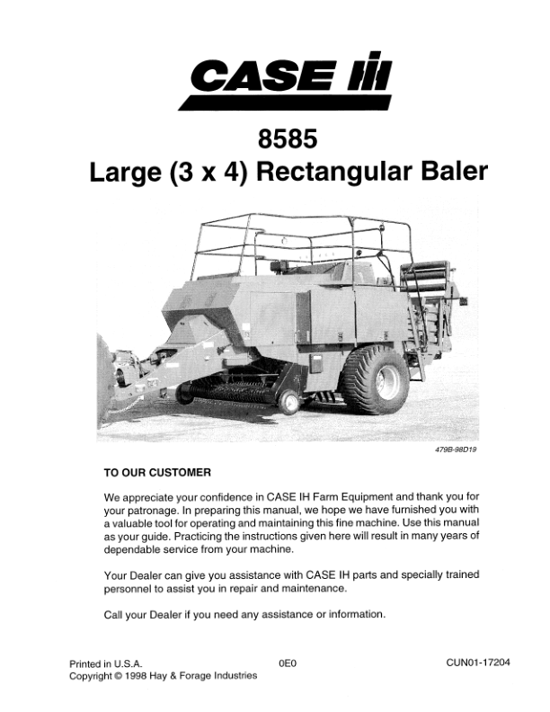 CASE 8585 Large 3 x4 Rectangular Baler Operation Manual CUN01-17204 This manual provides detailed instructions for the operation and maintenance of the Case 8585 Large 3 x 4 Rectangular Baler. Designed for agricultural and commercial use, this baler is used to compress loose material such as hay, straw, or other feed into compact rectangular bales. The manual includes step-by-step procedures for setup, operation, and troubleshooting to ensure efficient and safe use of the equipment. It is an essential resource for operators and maintenance personnel to maximize the performance and longevity of the baler.