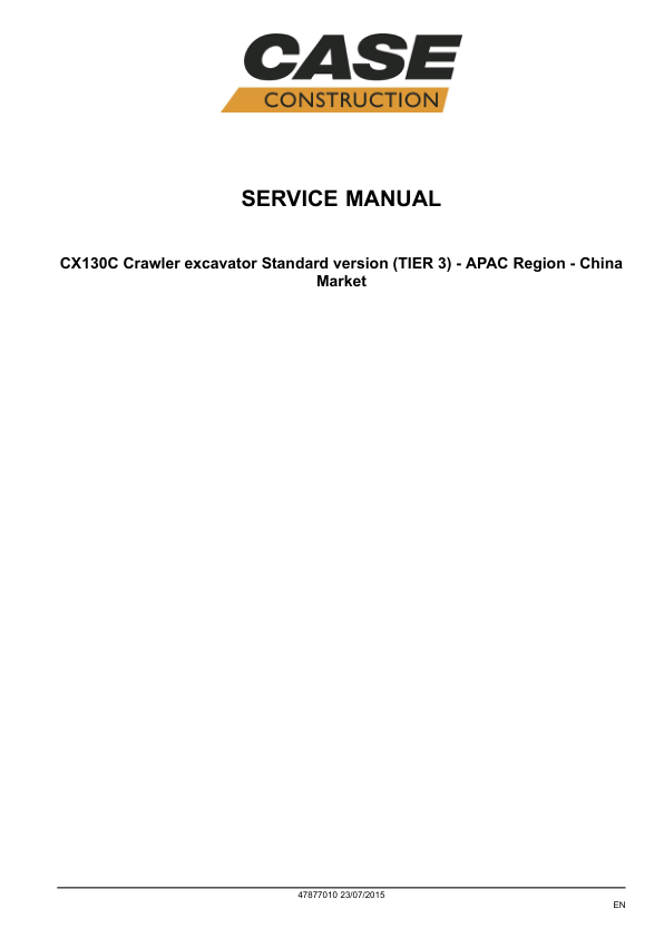 CASE CX130C Crawler Excavator Service Manual 47877010 APAC Region-China Market