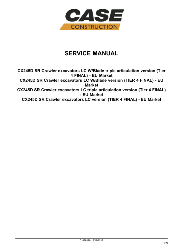 CASE CX245D SR Crawler Excavator Service Manual EU Market