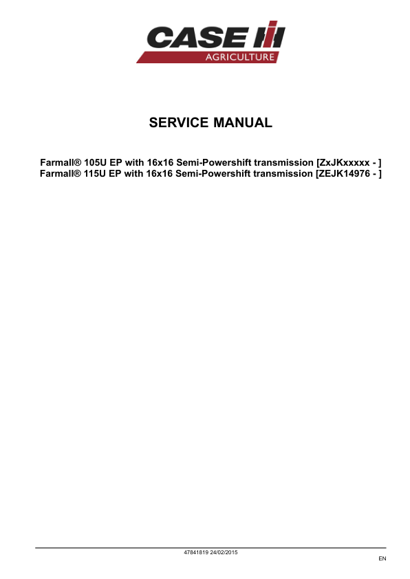 CASE Farmall 105U 115U EP With 16×16 Semi Powershift Transm. Tractor Service Manual