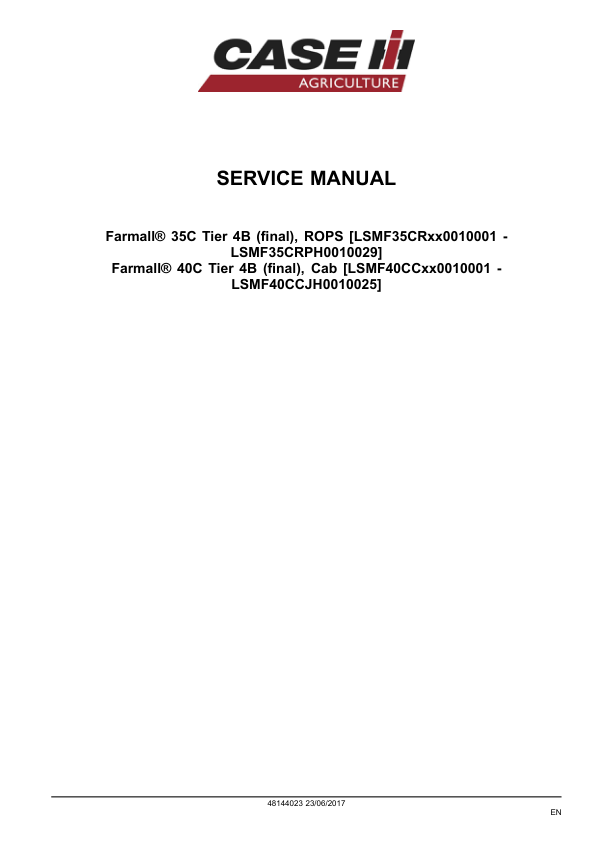 FARMALL® 40C Cab: PIN LSMF40CCxx0010001 to LSMF40CCJH0010025