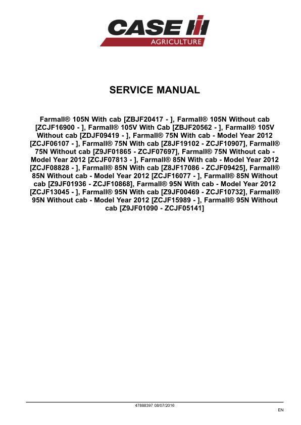 FARMALL® 95N with cab PIN Z9JF00469 – ZCJF10732; FARMALL® 95N with cab PIN ZCJF13045 and above;