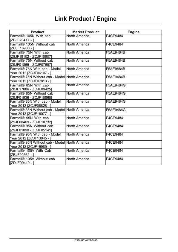 FARMALL® 75N with cab PIN Z8JF19102 – ZCJF10907; FARMALL® 75N with cab PIN ZCJF06107 and above;