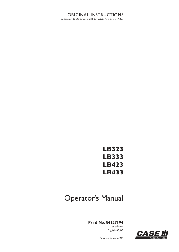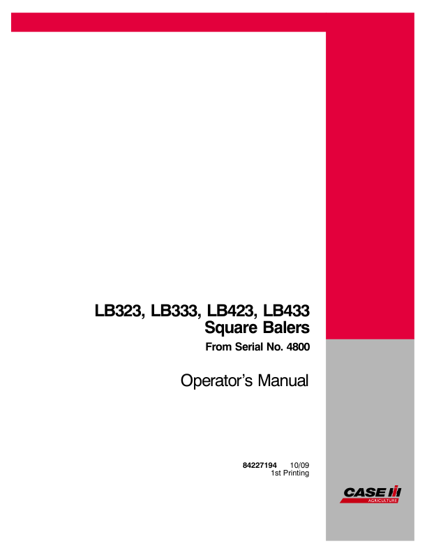 CASE LB323 LB333 LB423 LB433 Square Balers Operators Manual from SN 4800 without any changes. The CASE LB323, LB333, LB423, and LB433 Square Balers Operators Manual from SN 4800 is a comprehensive guide designed to assist operators in efficiently and safely using their baler equipment. This manual provides detailed instructions on setup, operation, maintenance, and troubleshooting for these specific models. It includes essential information about safety procedures, routine checks, and proper techniques to ensure optimal performance and longevity of the machinery. Whether for agricultural or industrial use, this manual is an invaluable resource for anyone operating or maintaining these square balers.