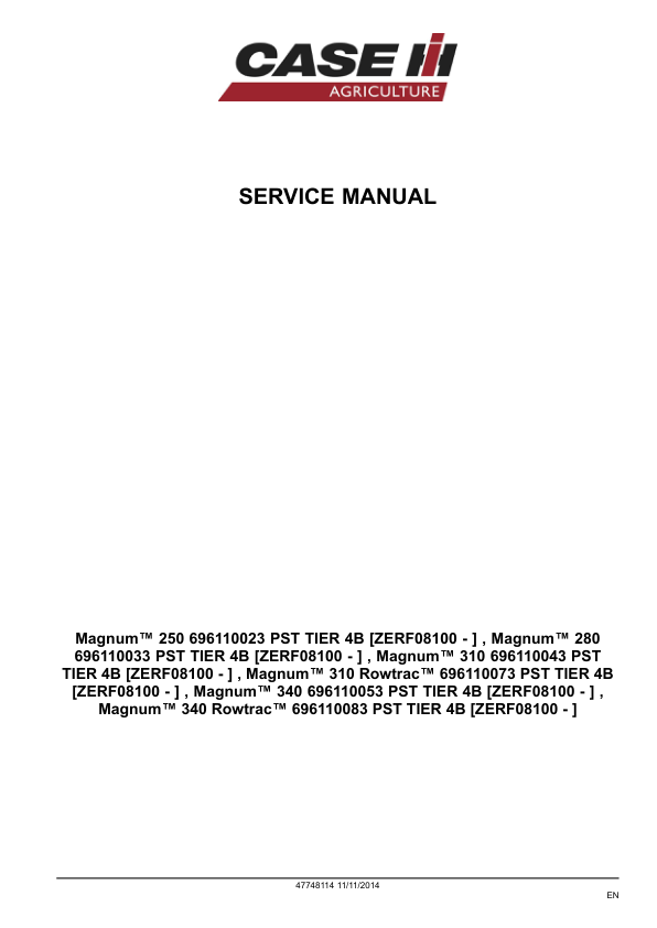 CASE Magnum 250 280 310 340 380 Rowtrack Tractors with PST Service Manual ZERF08100 and Above NA