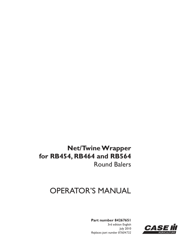 The CASE Net-Twine Wrapper for RB454 RB464 RB564 Round Balers Operators Manual 84267651 is a comprehensive guide designed specifically for the CASE Net-Twine Wrapper attachment used with the specified round balers. This manual provides detailed instructions on installation, operation, maintenance, and troubleshooting, ensuring optimal performance and longevity of the equipment. Whether you’re a seasoned operator or new to using the Net-Twine Wrapper, this manual offers clear and concise information to help you maximize efficiency and safety. It is an essential resource for anyone operating or maintaining these CASE round balers.