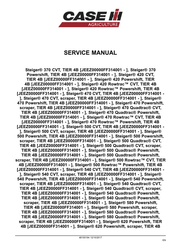 CASE Rowtrac 420 470 500 Steiger 370-620 Quadtrac 470-620 Tier 4B Tractor Service Manual