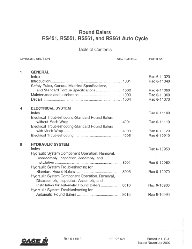 CASE RS451 RS551 RS561 and RS561 Auto Cycle Round Baler Service Manual 6-11000 R0 is a comprehensive guide designed to assist users in maintaining and repairing their CASE Auto Cycle Round Balers. This manual provides detailed instructions, diagrams, and troubleshooting tips to help ensure the smooth operation and longevity of the equipment. Ideal for both professionals and DIY enthusiasts, it covers a wide range of service procedures, from routine maintenance to complex repairs. With clear, step-by-step guidance, this manual is an invaluable resource for anyone looking to keep their baler in optimal working condition.