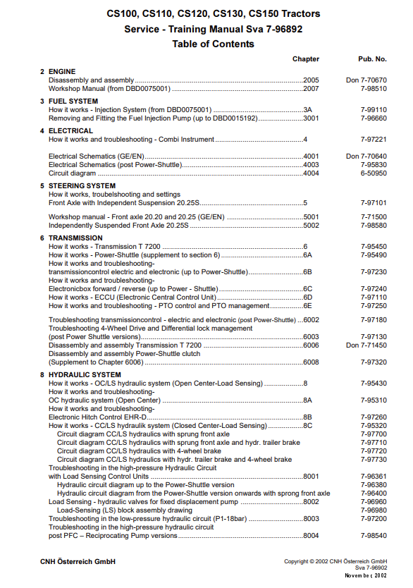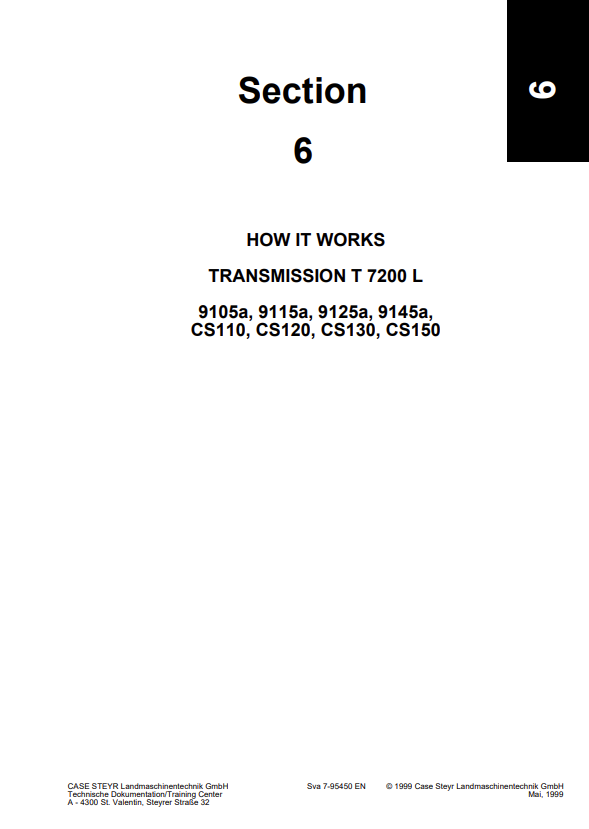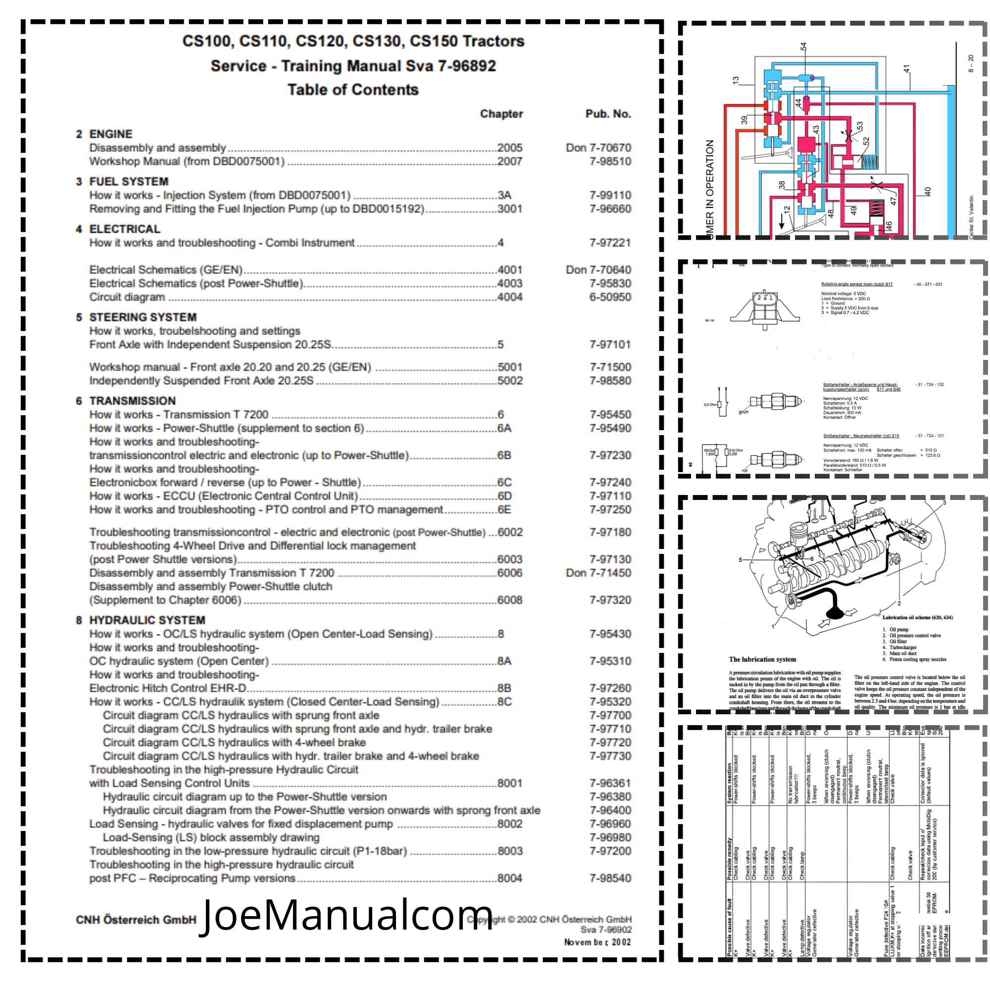 CASE Steyr CS110 CS120 CS130 CS150 Tractors Workshop Manual and Documentation is pack 3-file bundle for CASE Steyr CS110 / CS120 / CS130 / CS150 (tractors): Workshop Manual, Transmission T7200 – How It Works, and Hydraulic Schematics (A3 foldouts). A complete service set with repair procedures, T7200 transmission theory, and large A3 hydraulic diagrams for easy circuit tracing.