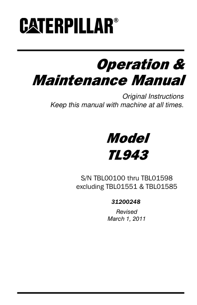 CAT TL943 Telehandler Operation and Maintenance Manual The CAT TL943 Telehandler Operation and Maintenance Manual is a comprehensive guide designed to provide operators and technicians with detailed instructions for the safe and efficient use of the CAT TL943 telehandler. This manual covers essential topics such as operating procedures, routine maintenance tasks, troubleshooting common issues, and safety guidelines. With clear instructions and illustrations, it ensures that users can maximize the performance and longevity of their telehandler while adhering to best practices in equipment operation and upkeep.