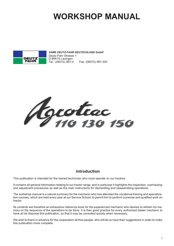 Deutz Fahr Agrotrac 110 130 150 Workshop Manual