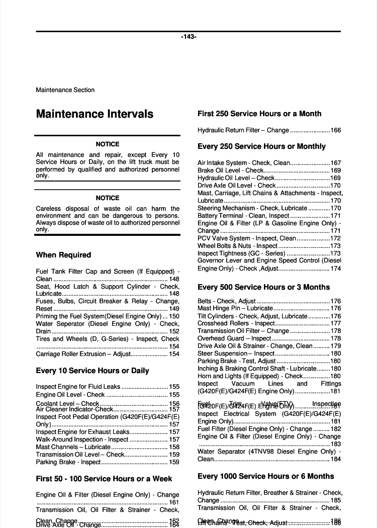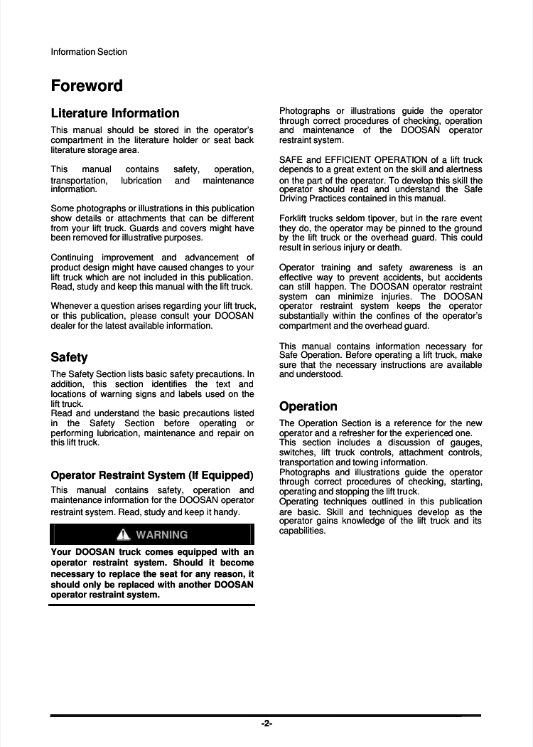 Doosan D G GC Forklift Trucks Operating and Maintenance Manual. This manual provides comprehensive guidance on the safe and efficient operation and maintenance of Doosan D, G, and GC series forklift trucks. It includes detailed instructions, diagrams, and troubleshooting information to ensure optimal performance and longevity of your equipment. Doosan D G GC Forklift Trucks Operating and Maintenance Manual. This manual serves as a vital resource for operators and technicians, offering in-depth procedures for operating, maintaining, and repairing Doosan D, G, and GC series forklift trucks. It covers essential topics from daily checks to complex repairs, promoting safety and maximizing uptime.