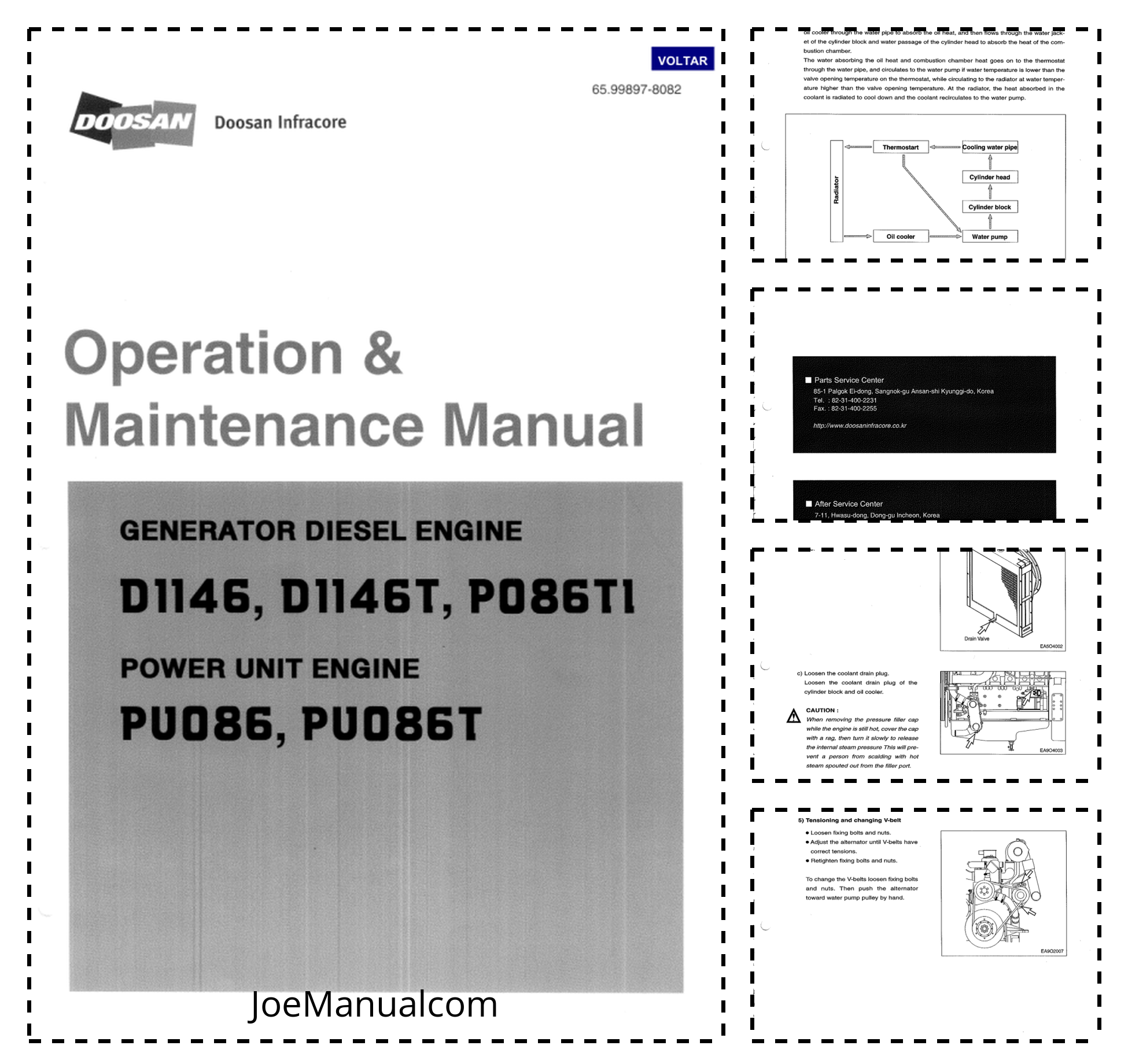 Doosan D1146 D1146 T PO86 TL Generator Diesel Engine Operation and Maintenance Manual. This comprehensive manual provides essential guidance for the proper operation, maintenance, and troubleshooting of Doosan D1146, D1146T, PO86, and TL series generator diesel engines. It includes detailed instructions, diagrams, and specifications to ensure optimal engine performance and longevity.