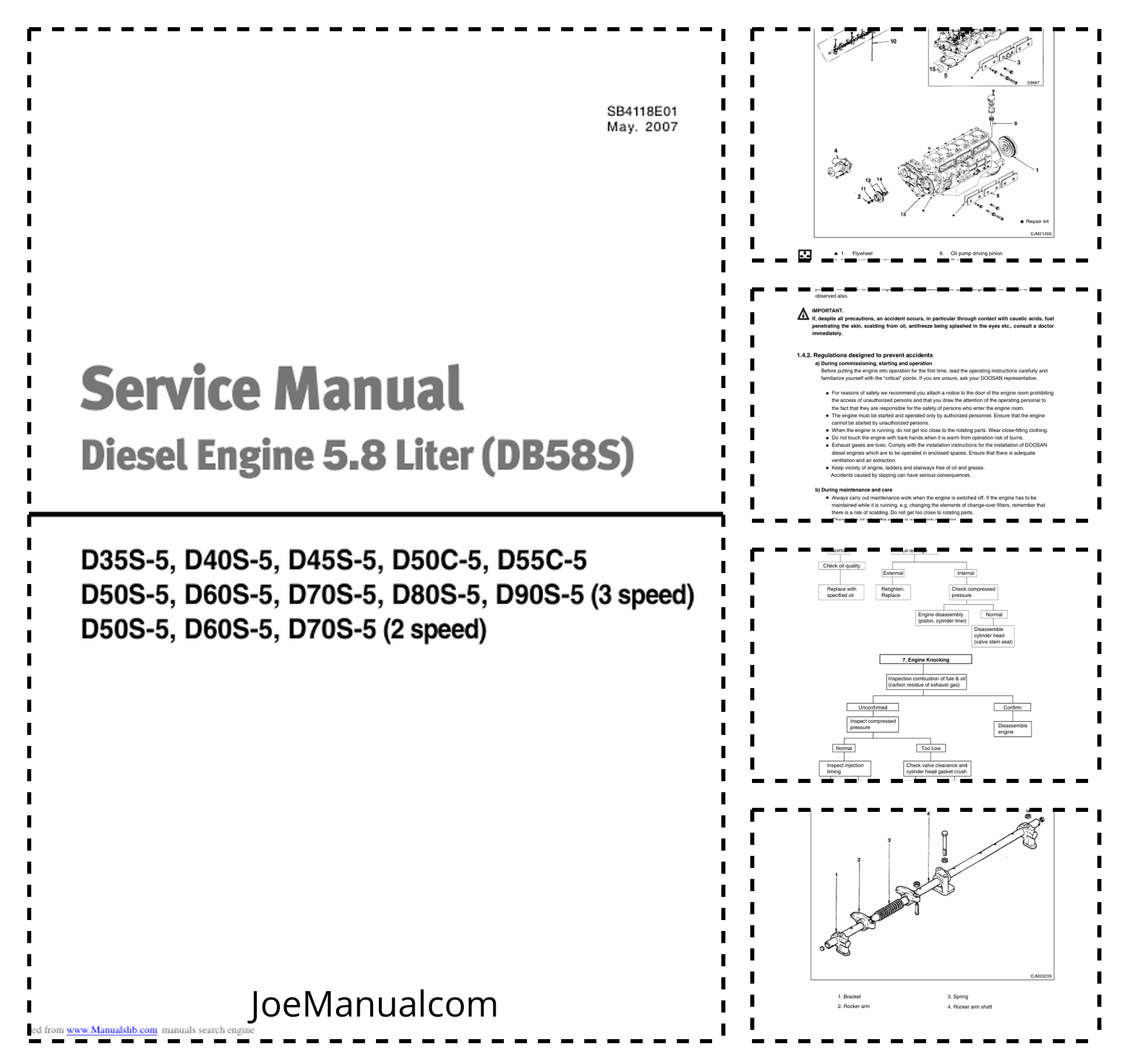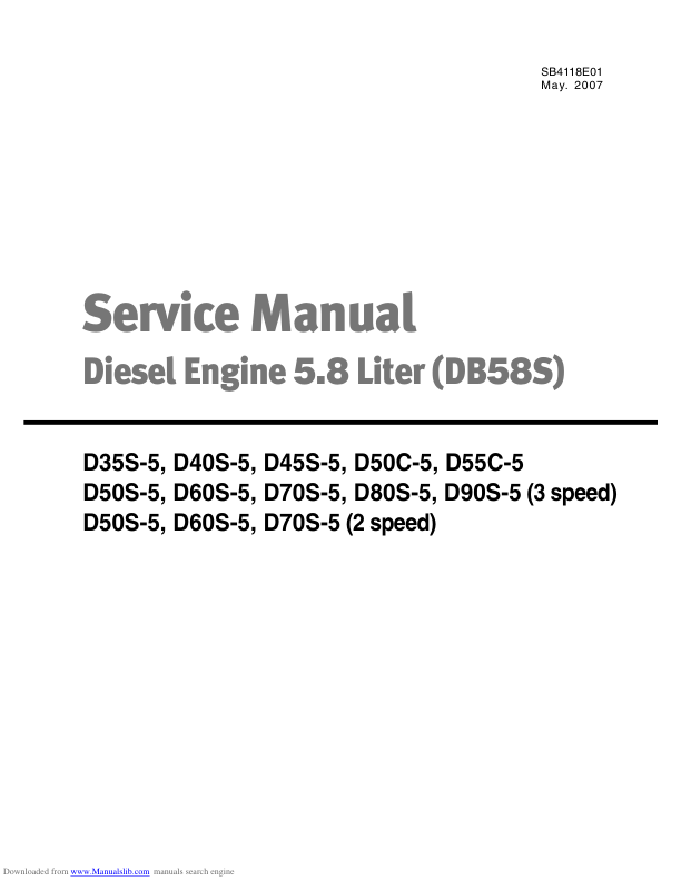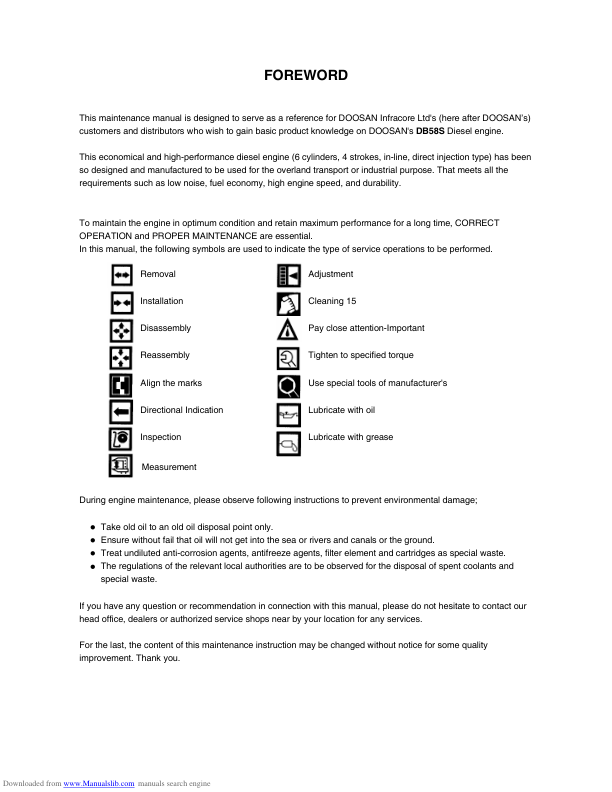 Doosan DB58 S Diesel Engine Service Manual. This manual provides comprehensive technical information and detailed instructions for the maintenance, repair, and overhaul of the Doosan DB58 S diesel engine. It is an essential resource for technicians and mechanics working with this engine model, offering guidance on troubleshooting, component replacement, and performance optimization.