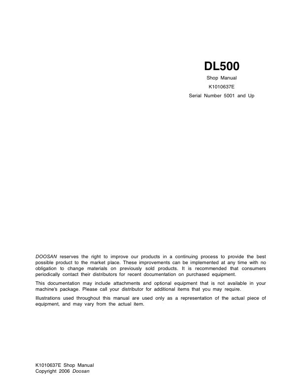 Doosan DL500 Wheel Loader Workshop Manual 5001 and Up. This comprehensive workshop manual provides detailed service and repair information for Doosan DL500 wheel loaders with serial numbers 5001 and up. It includes step-by-step instructions, diagrams, and specifications necessary for proper maintenance and troubleshooting. This manual is an essential resource for technicians and mechanics working on these machines.