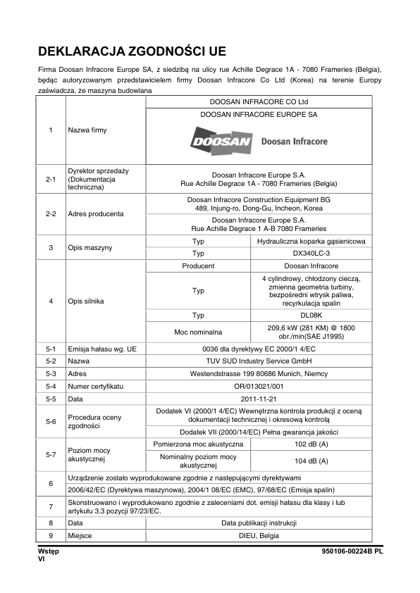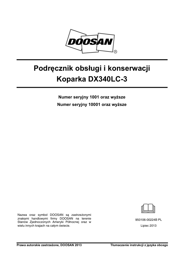 Doosan DX340LC-3 Excavator Operation and Maintenance Manual PL