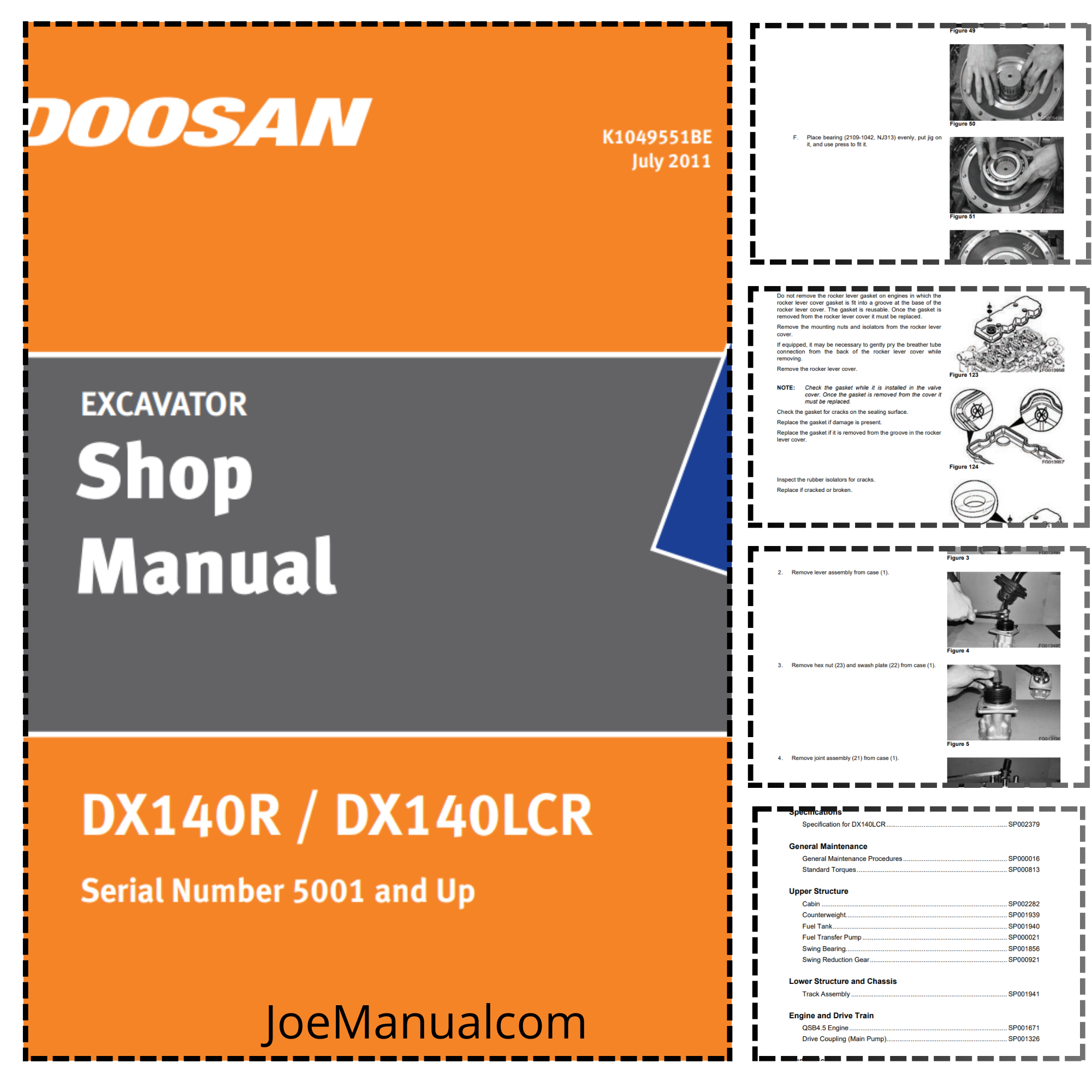 The manual provides detailed instructions for the repair and maintenance of the DOOSAN SX140R and DX140LCR excavators. It includes troubleshooting procedures, technical specifications, and component descriptions. The manual offers step-by-step guidance for disassembly, inspection, and reassembly of various systems and parts. This document is essential for technicians to ensure the excavators’ reliability and optimal performance.