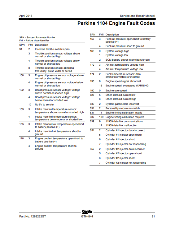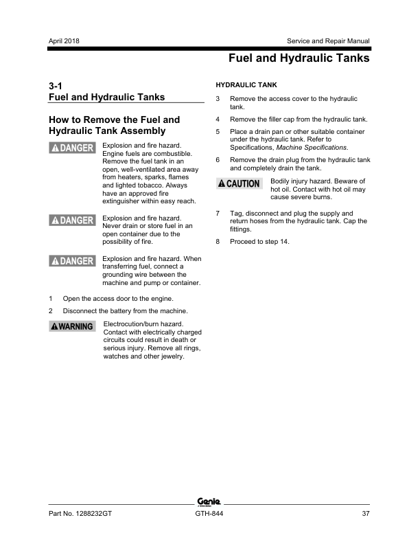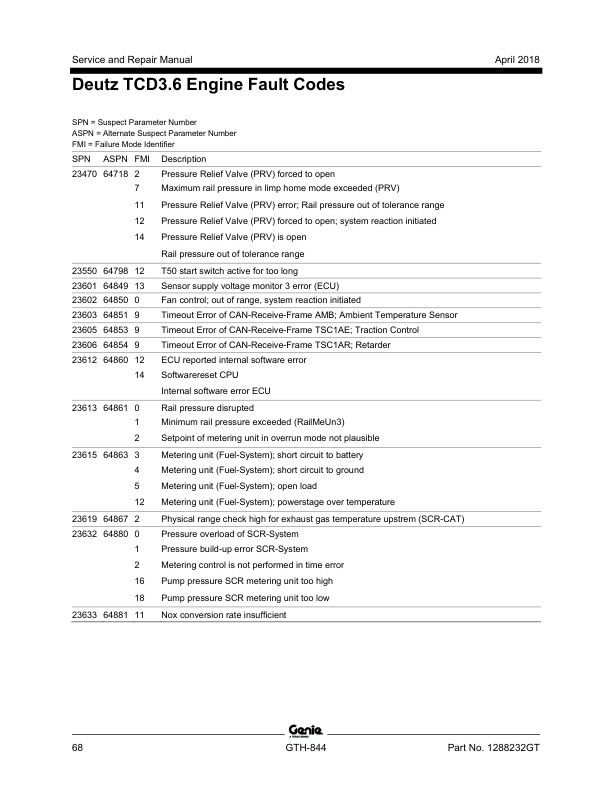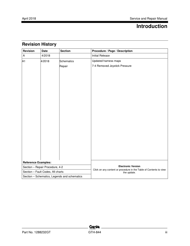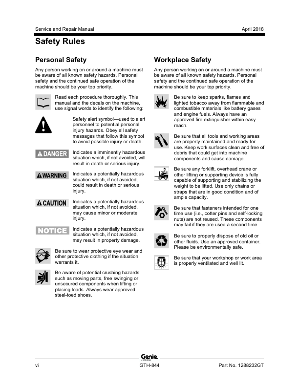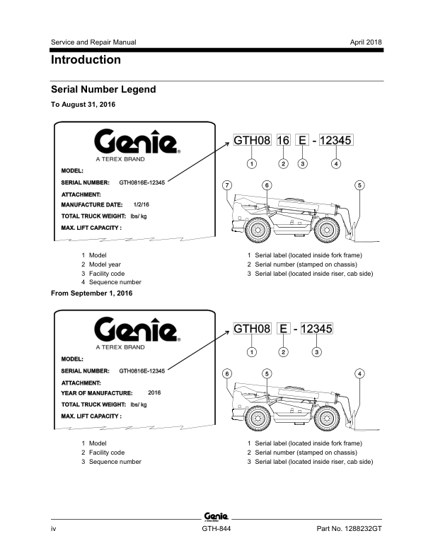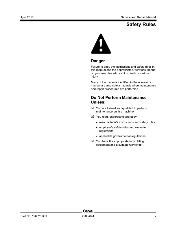 Genie TEREX GTH-844 Telehandler Service Manual from SN GTH08E-11500