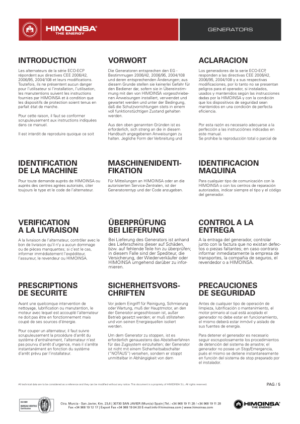 Himoinsa ECO ECP Self Regulating Alternators Operating and Maintenance Manual 9806/4750 Printed Book